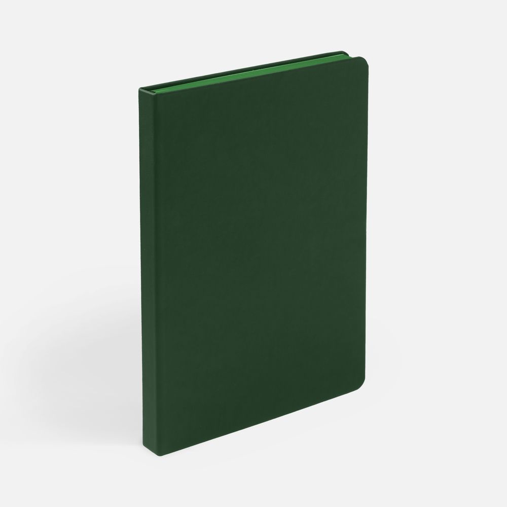 Ежедневник с твердой обложкой и тонированным обрезом, выполнен из материала Soft Touch, зеленый FF, дополнен ляссе в цвет обложки.