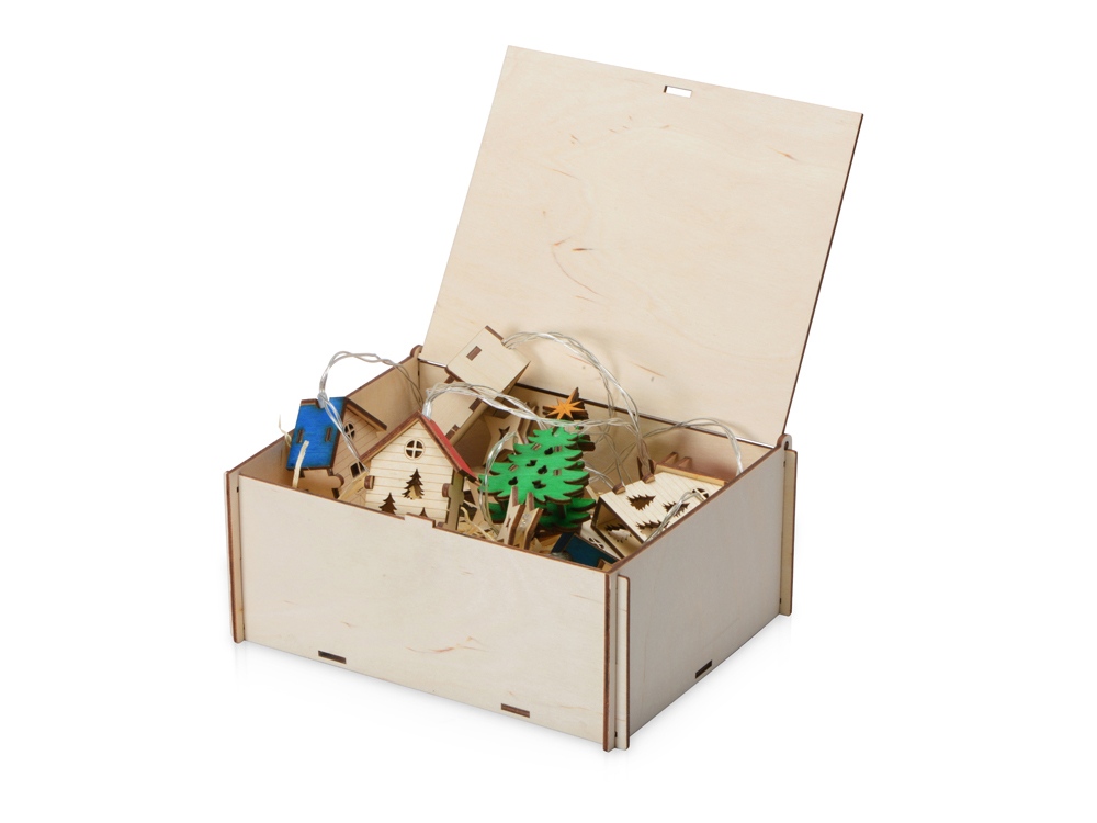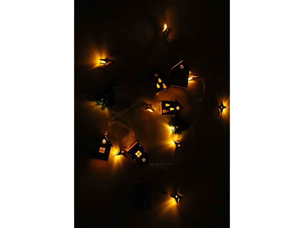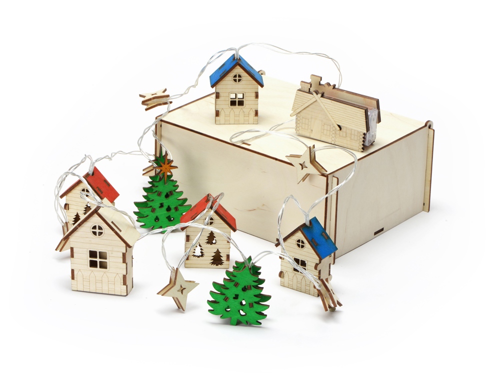 Светодиодная новогодняя елочная гирлянда постоянного свечения с цветными фигурками из натуральной березовой фанеры. Работает от 2-х батареек АА (в комплекте). Упакована в деревянную подарочную коробку со стружкой.