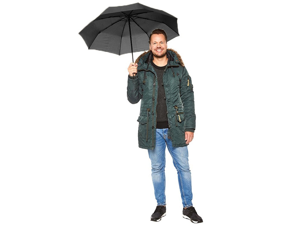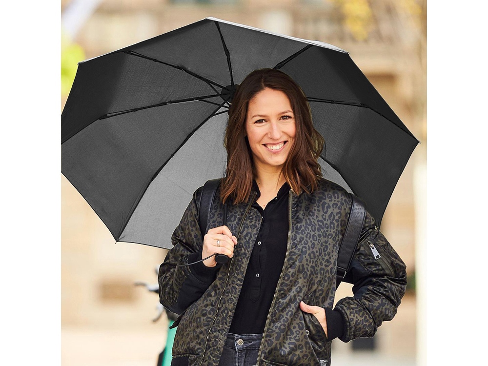 Добротный автоматический зонт с куполом из эпонжа и гибкими спицами из стекловолокна спасет от дождя и выстоит против порывов ветра. Чехол в комплекте