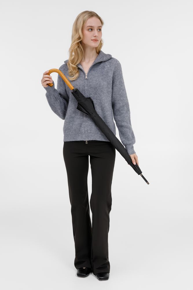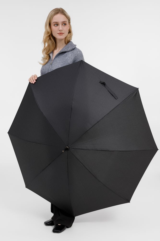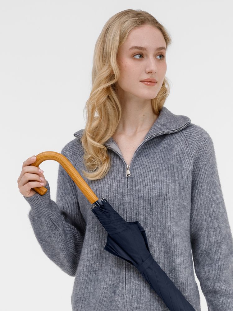 Элегантный зонт с большим куполом и деревянной J-образной ручкой.