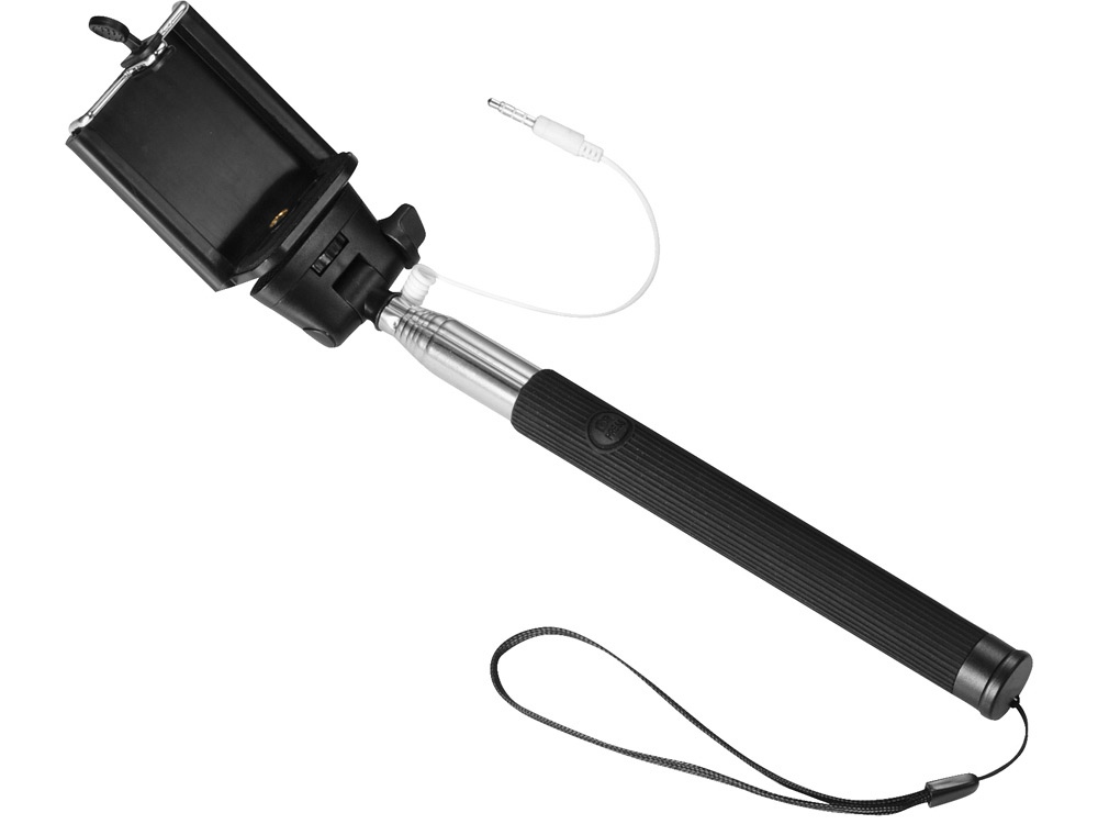 Проводной монопод. Сделайте идеальный селфи с этим выдвижным моноподом (до 90 см). Не требует батареи или использования приложения. Просто подключите 3,5 мм аудио разъем в телефон (совместим только с телефонами, у которых есть разъем 3.5 мм) и нажмите на кнопку, расположенную на ручке. Регулируемый держатель. Силикон, сталь и ПВХ.