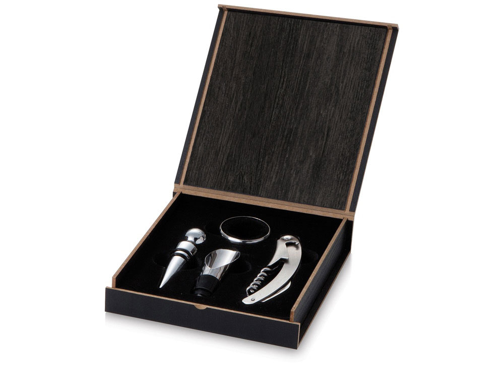 Оригинальный подарок к любому празднику. Подарочный набор аксессуаров для вина в деревянной коробке порадует истинного ценителя. В наборе штопор, пробка, кольцо для бутылки и воронка-аэратор. На деревянную коробку можно нанести изображение по вашему эскизу.