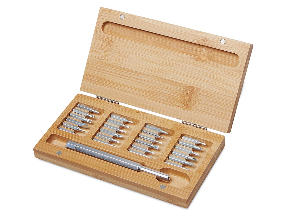 Стильный и практичный набор отверток в элегантном корпусе из натурального бамбука. Компактный кейс закрывается на магниты, а верхняя крышка отмечена круглым красным стикером для удобной идентификации. Внутри — отвертка и 24 наиболее востребованные биты: крестовые, плоские и звездочки, которые подойдут для решения большинства бытовых и профессиональных задач. Набор выполнен из экологичных материалов — прочной стали и натурального бамбука. Классическая прямоугольная форма без выступающих деталей делает его особенно удобным для персонализации и нанесения логотипа.