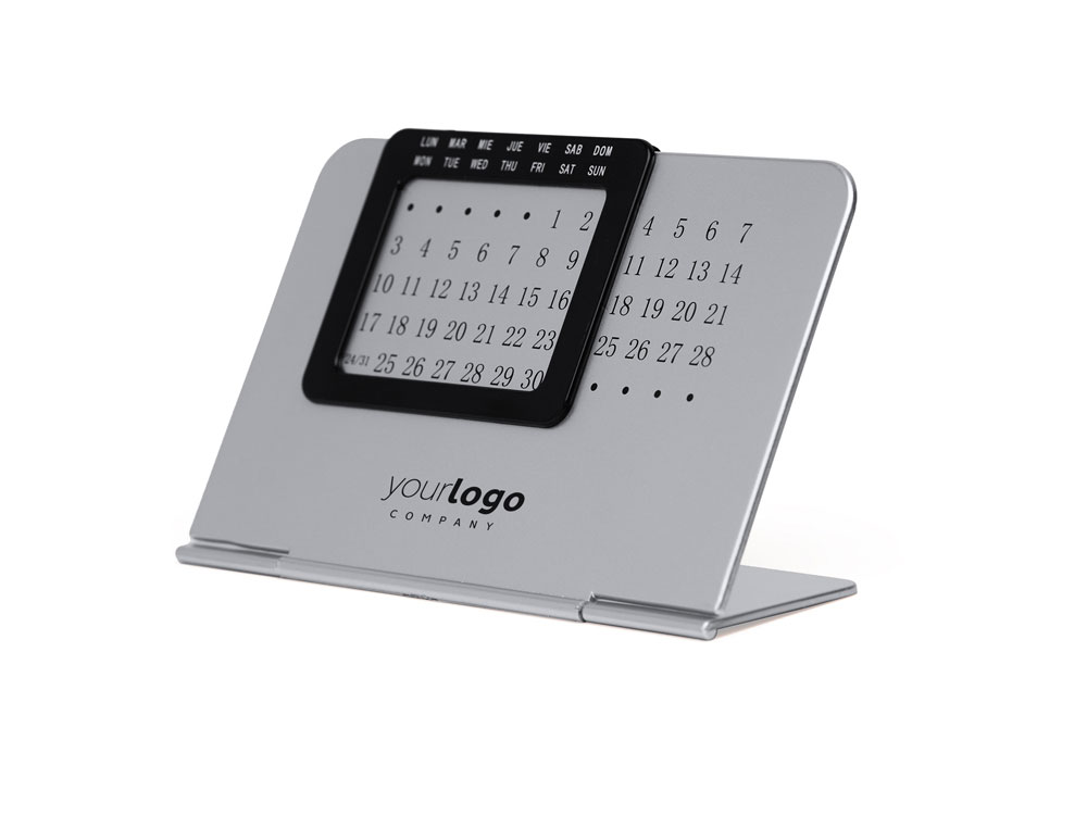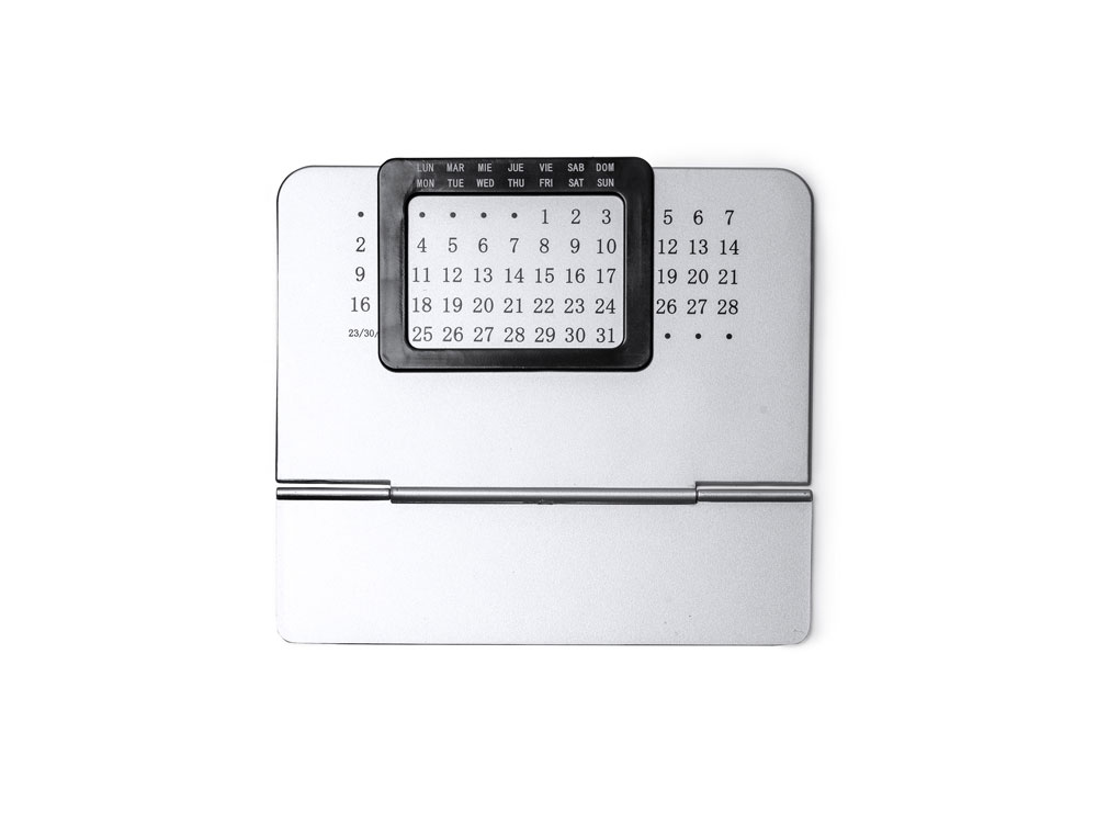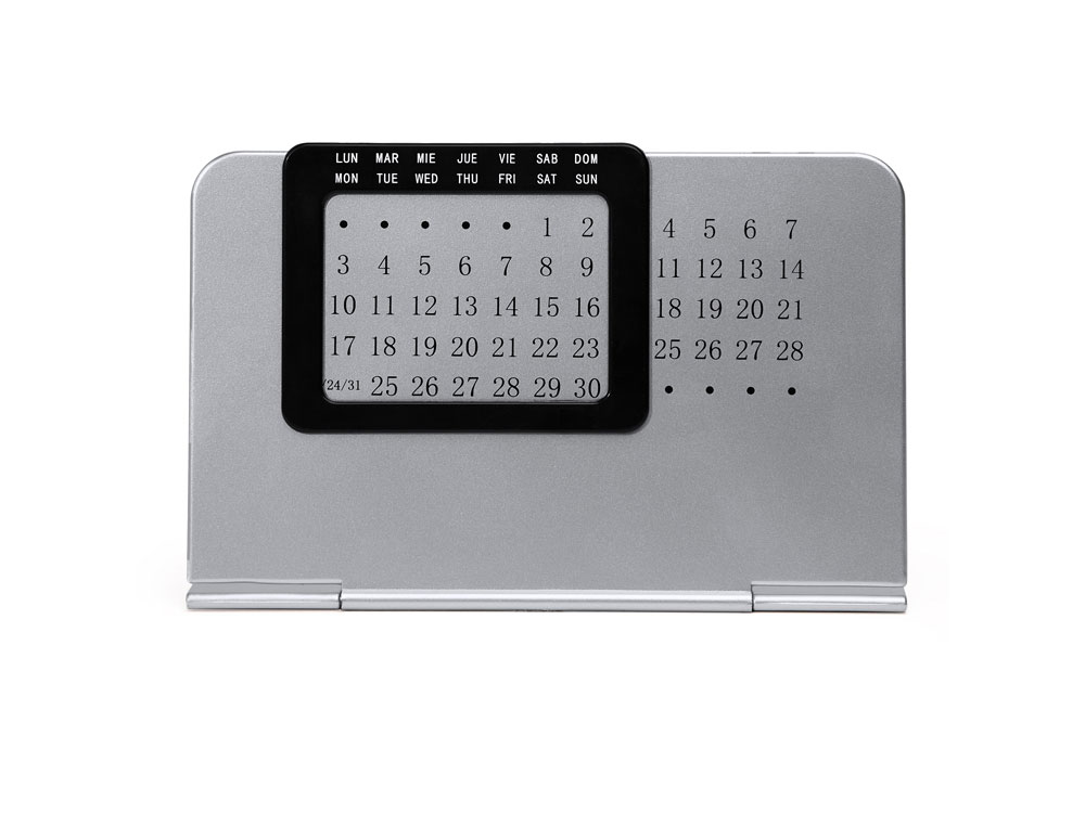 Вечный настольный календарь, состоящий из двух частей: одной серебряной подставки с числовой панелью и черной выдвижной рамки с днями недели на испанском и английском языках.