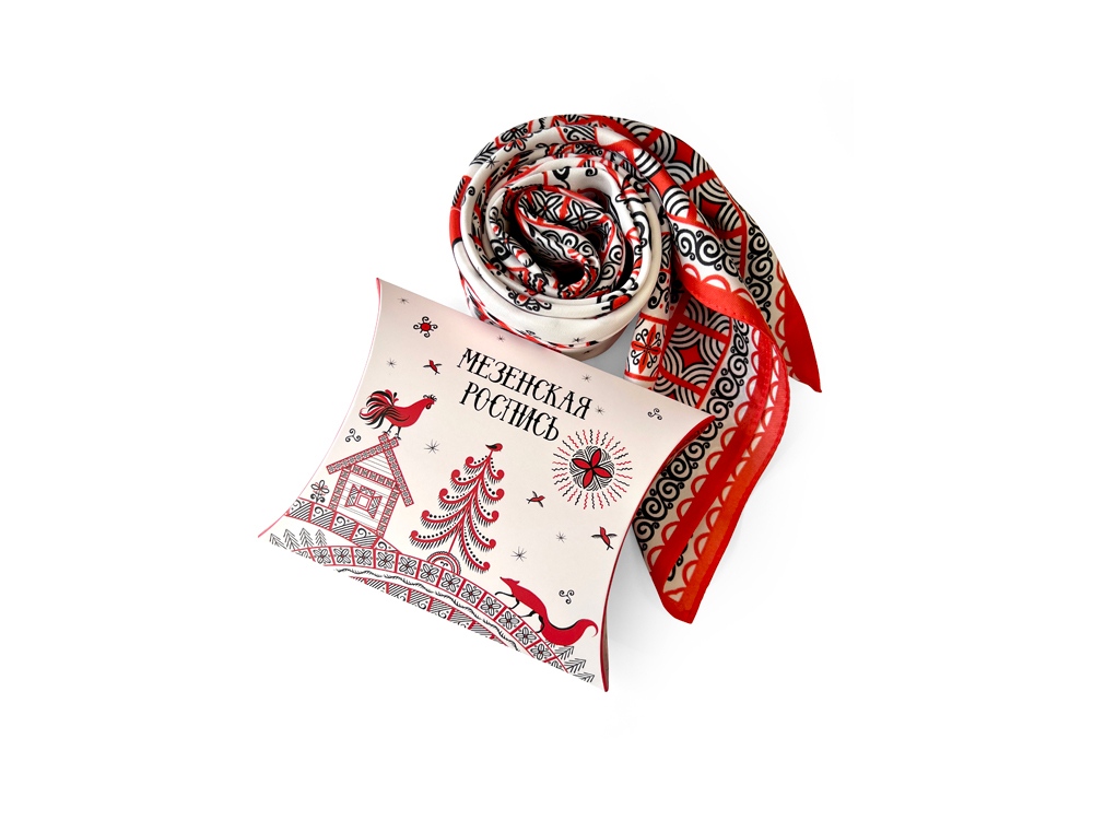Самобытный орнамент знаменитой мезенской росписи, отличающейся зашифрованным символизмом, лег в основу элегантного платка Мезенская роспись. Петух и лиса. Каждый элемент принта имеет особое значение, и располагается в строго определенном месте, создавая целый рассказ. Ранее такими рисунками украшали избы, посуду и кухонную утварь, передавая послание поколениям.