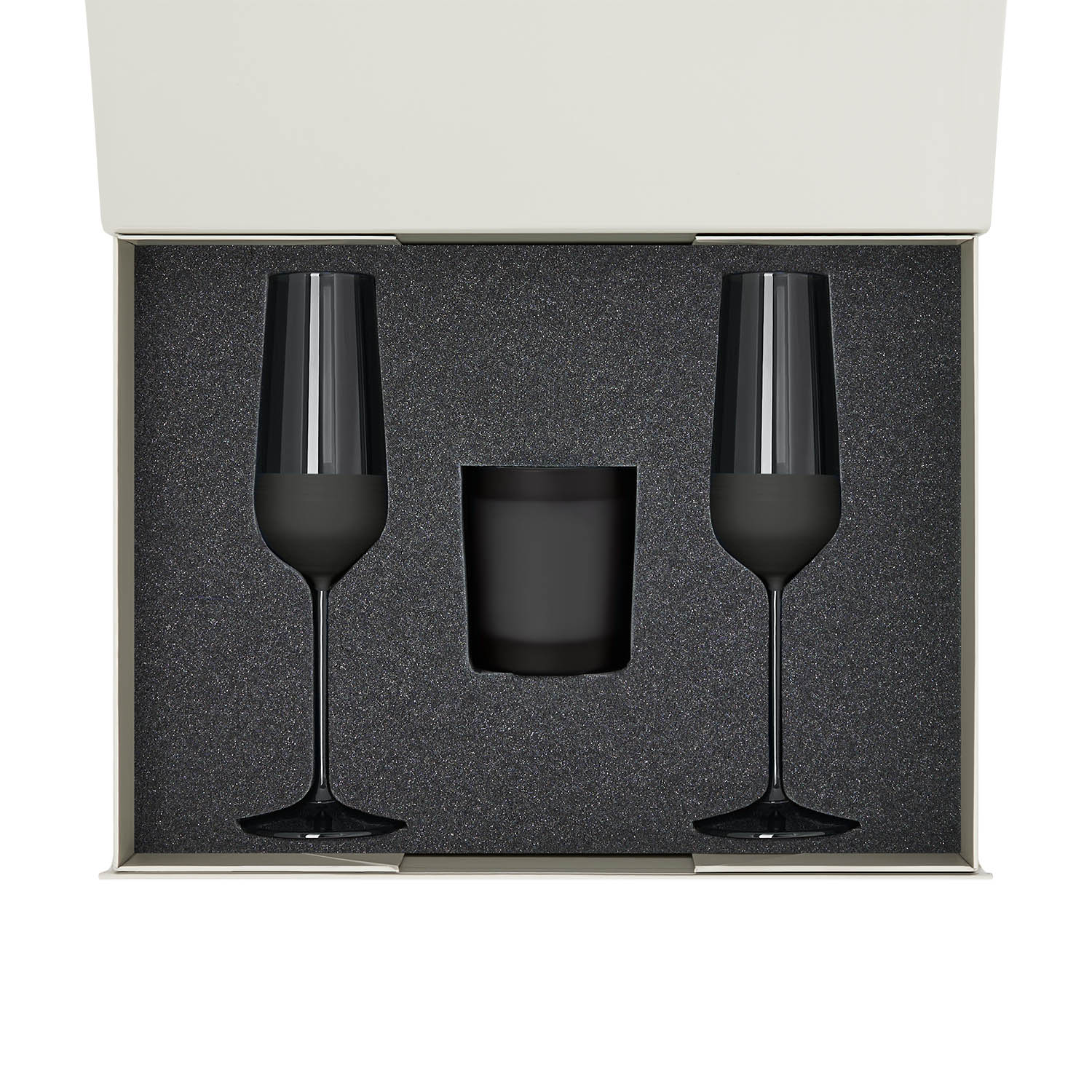 Подарочный набор свеча Enigma + 2 бокала для шампанского Black Edition в серой коробке