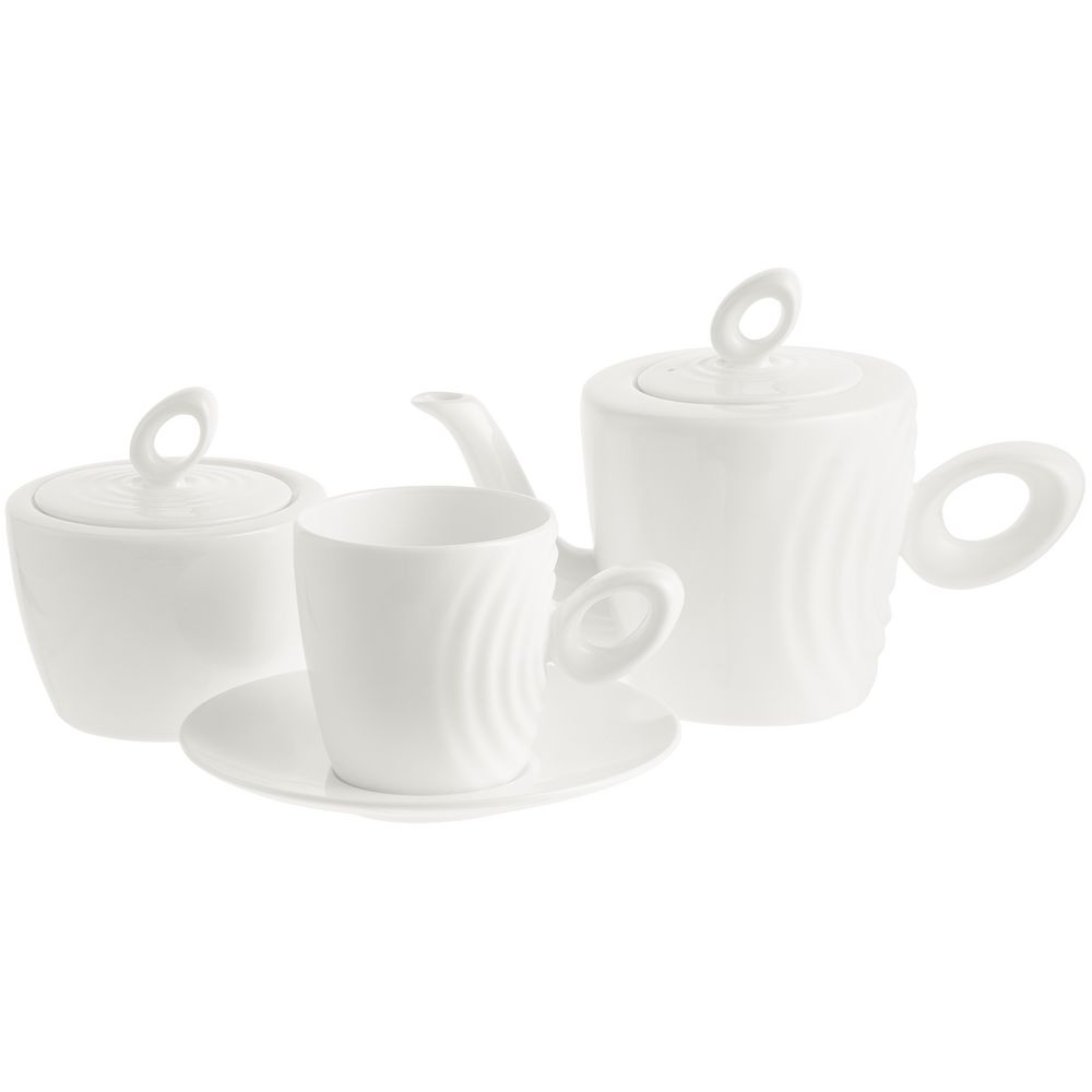 Крышка сахарницы создана в скульптурной технике: фарфор словно запечатлел сам момент движения. Необычная ручка предметов символизирует камень, от которого появляются завораживающие круги на воде.