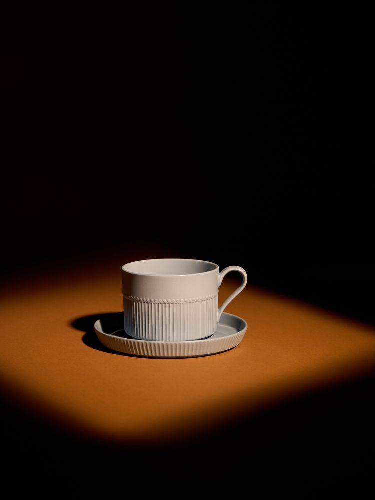 Орнамент корпуса кружки и высокого бортика блюдца напоминает изящные каннелюры — вертикальные желобки на колонне. Это добавляет всему изделию изысканности и стилистической завершенности, благородства и античной строгости.