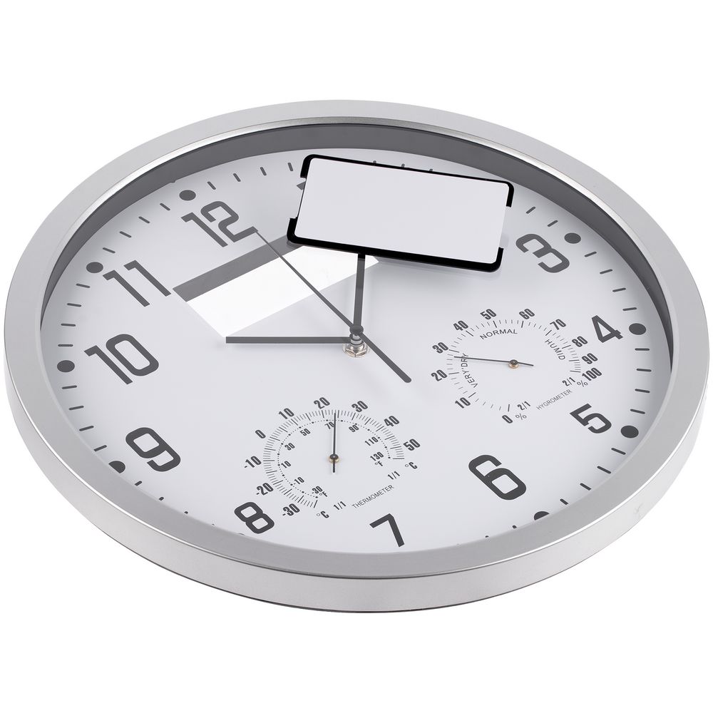 Классические настенные часы с термометром и гигрометром. В верхней части циферблата находится планка для нанесения логотипа, которая легко извлекается с тыльной стороны корпуса.