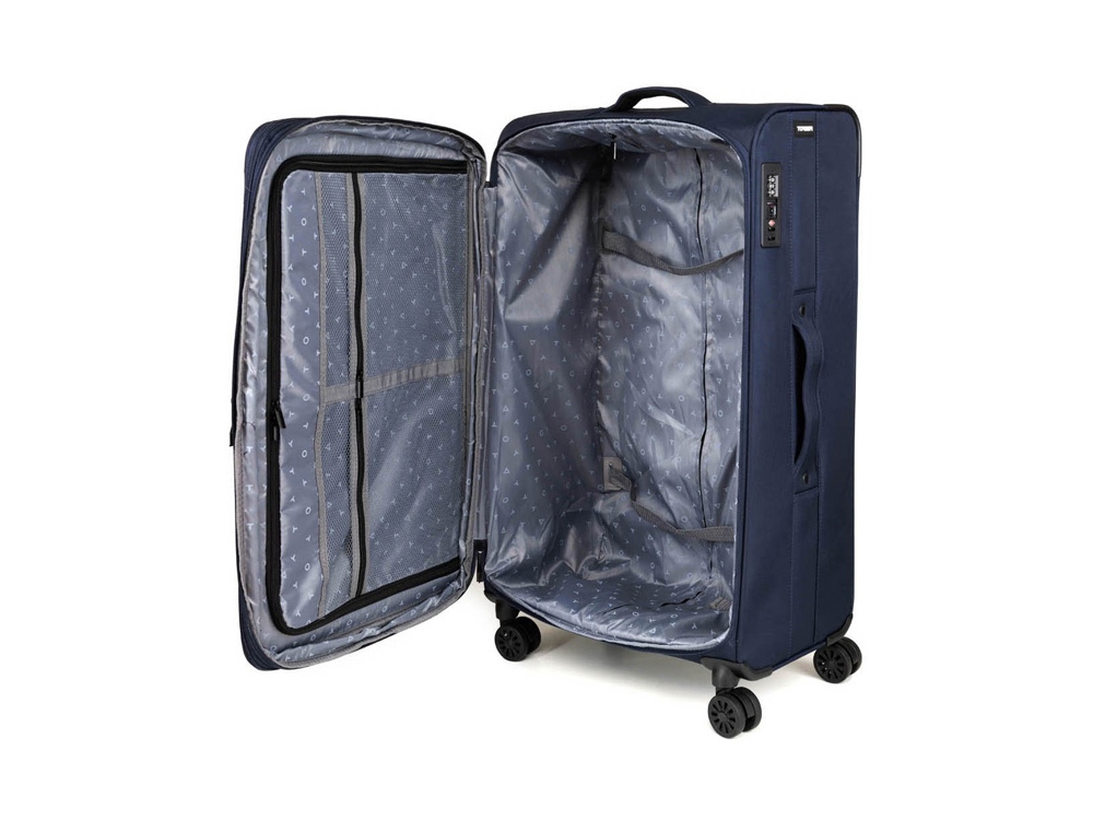 Чемодан полностью раскрывается на 2 отделения, с перегородкой на молнии и ремнями для надежной фиксации вещей на месте.
