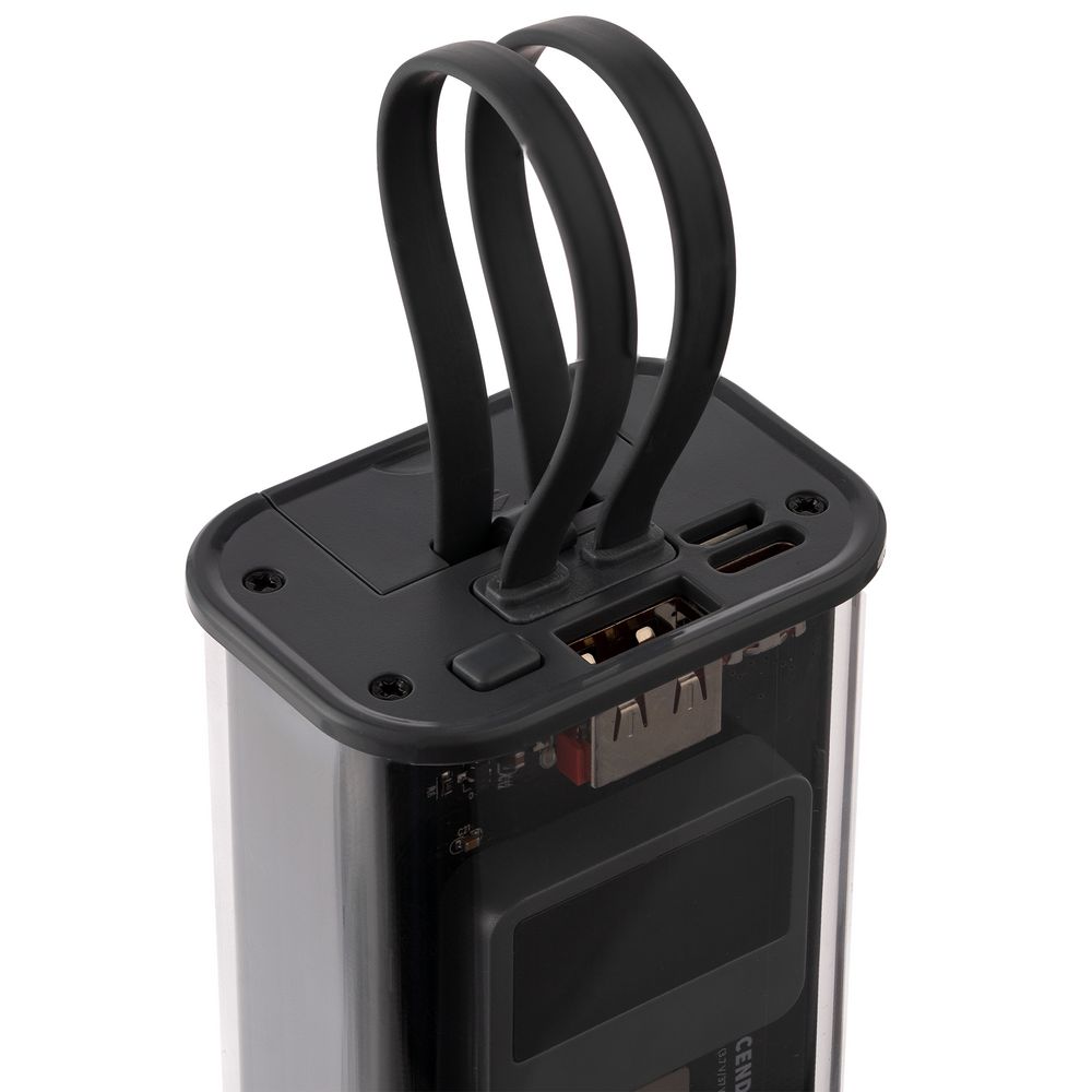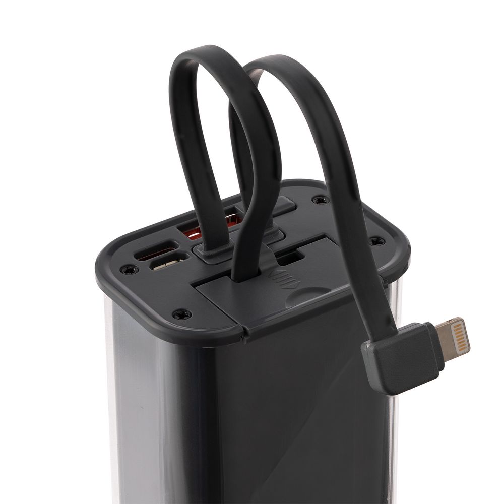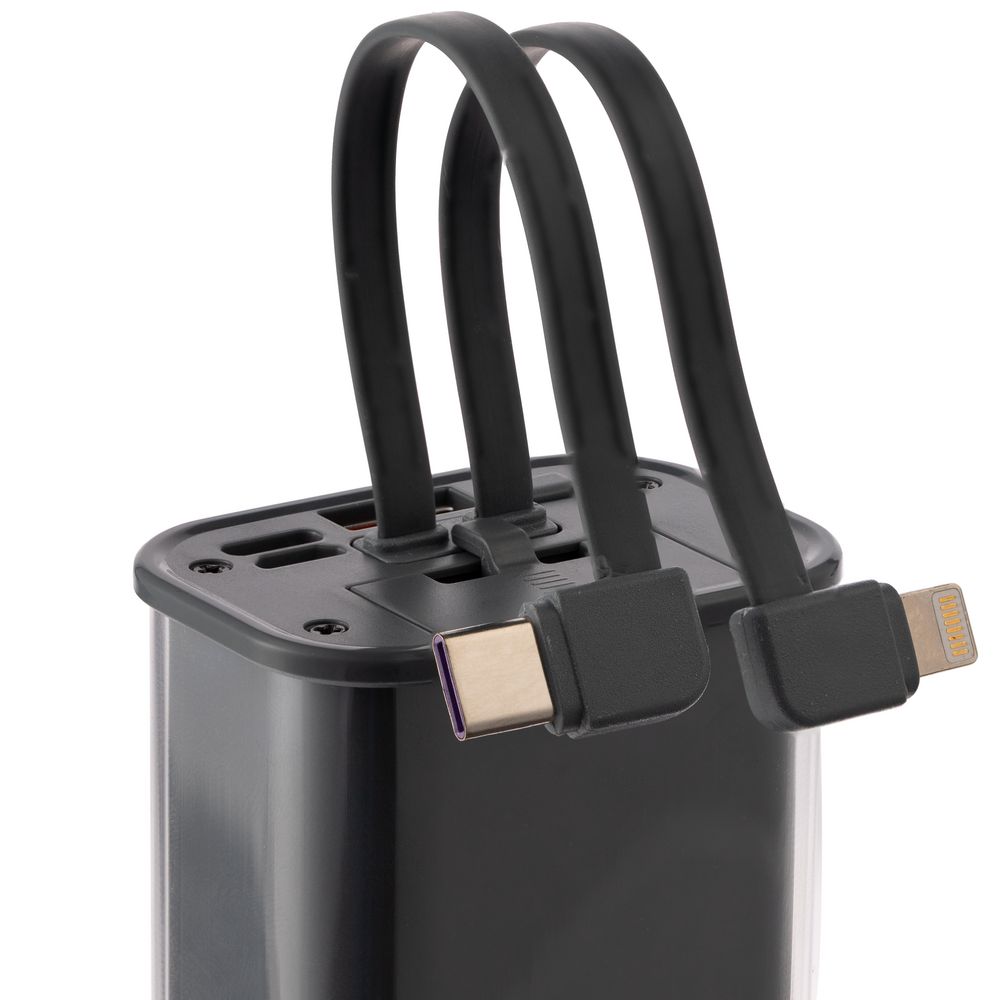 Встроенные кабели позволяют заряжать устройства с разъемами USB Type-C и Lightning.