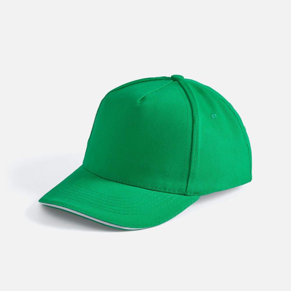 Модель бейсболки с 5-ю клиньями без лобового шва из плотного чесаного хлопка.