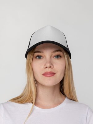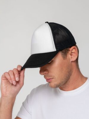 Стандартная модель с 5 клиньями без лобового шва в нестандартном исполнении. Передний клин и козырек выполнены из полиэстера с наполнителем из поролона, боковые и задние клинья — из сетки. Размер регулируется с помощью пластиковой застежки.