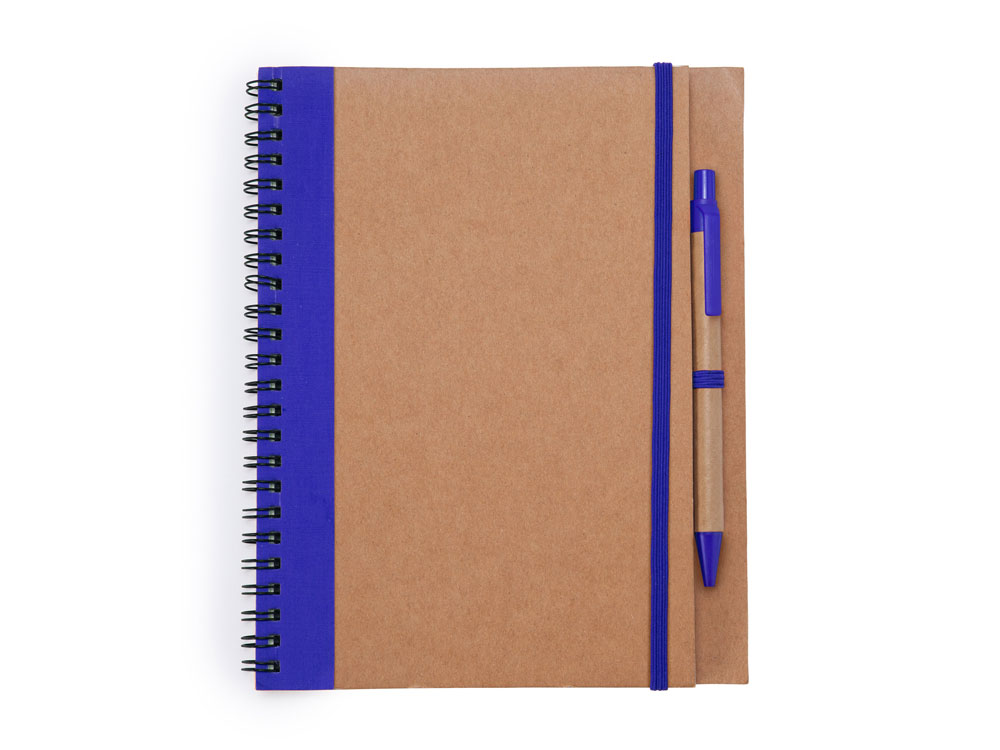 Блокнот на спирали с жесткой обложкой из переработанного картона. Включает шариковую ручку с синими чернилами. 60 простых листов.