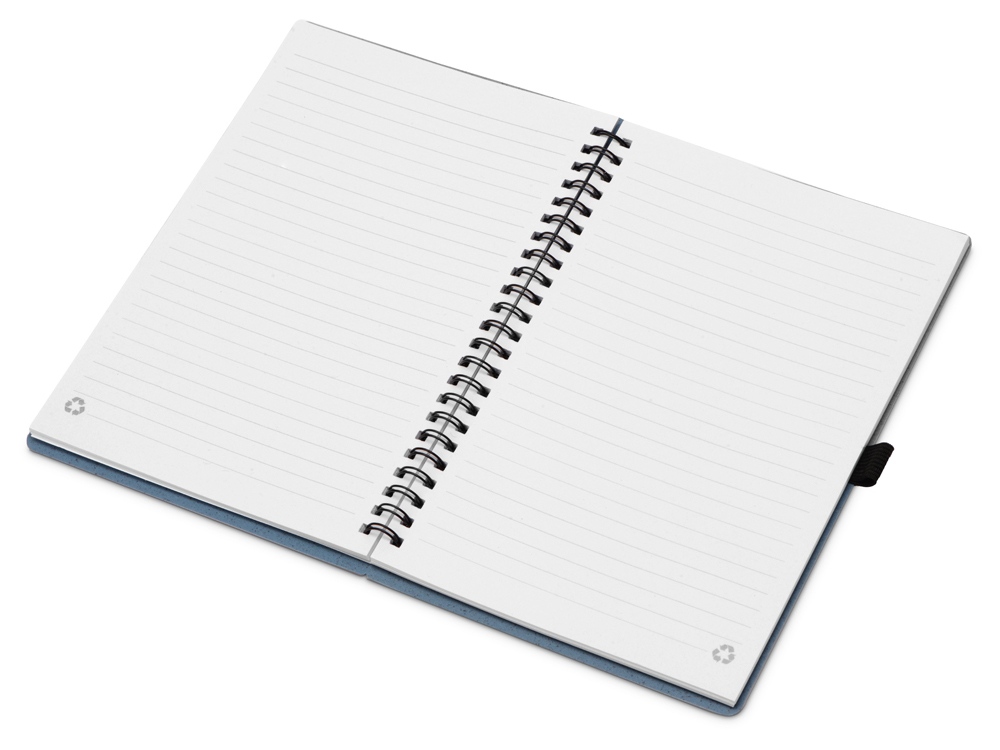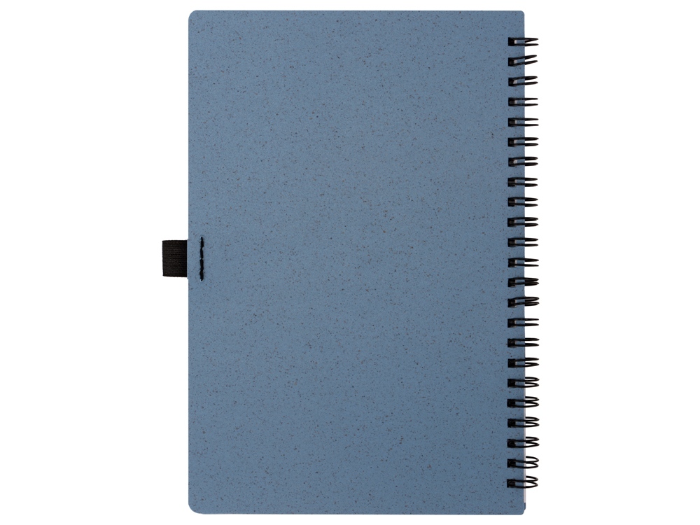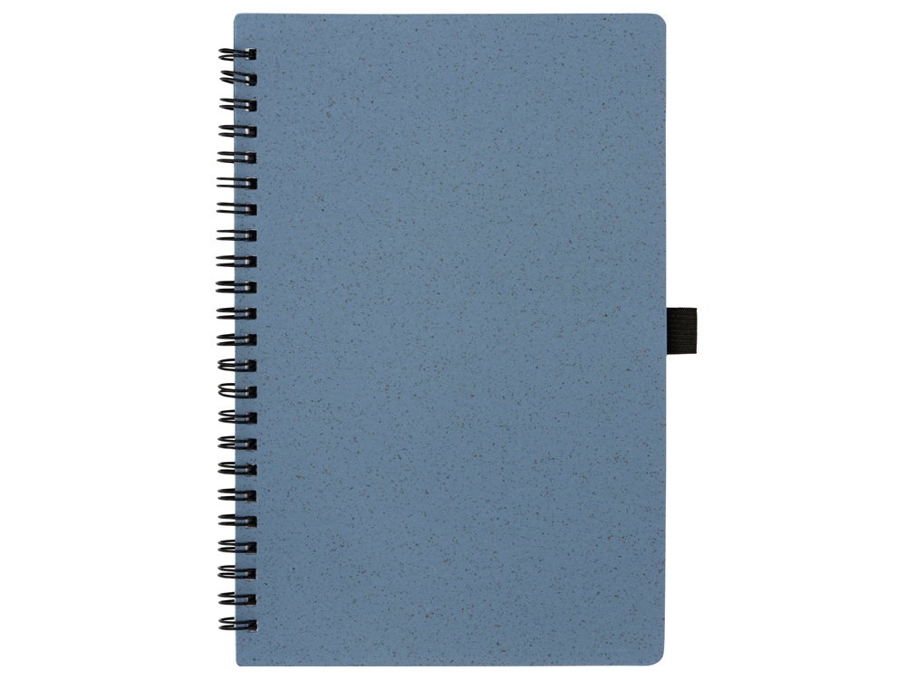 Блокнот с обложкой из переработанной пшеницы и пластика. Блок состоит из 70 листов переработанной бумаги белого цвета. Крепление — пружина. Дополнен петлей для ручки.