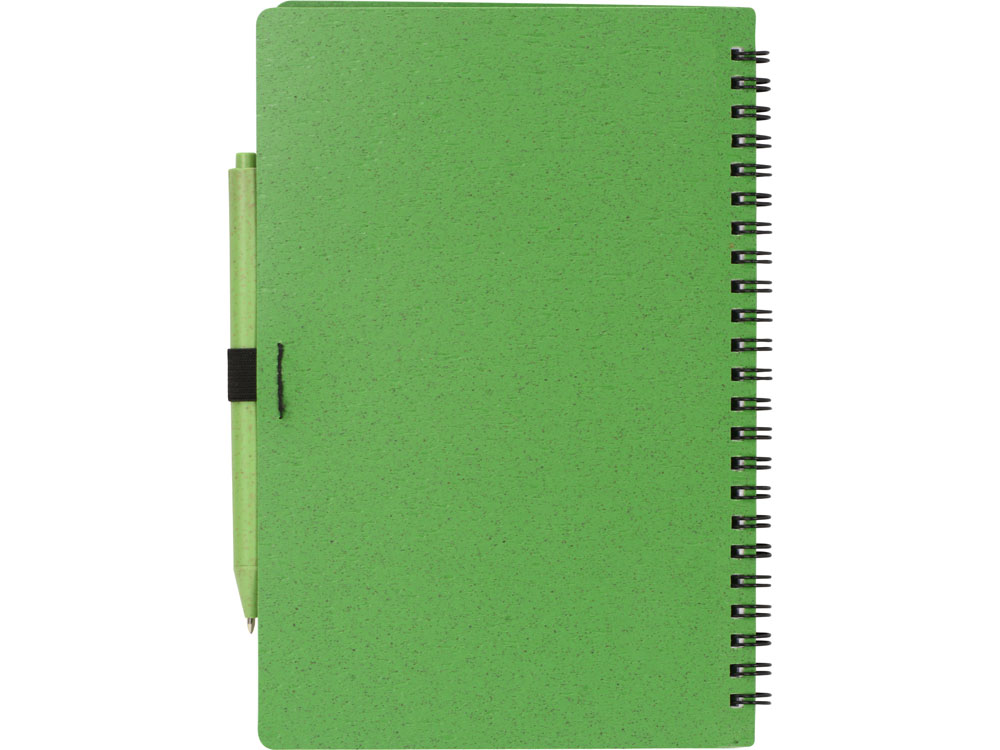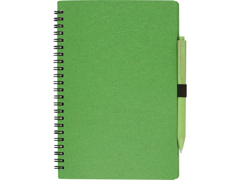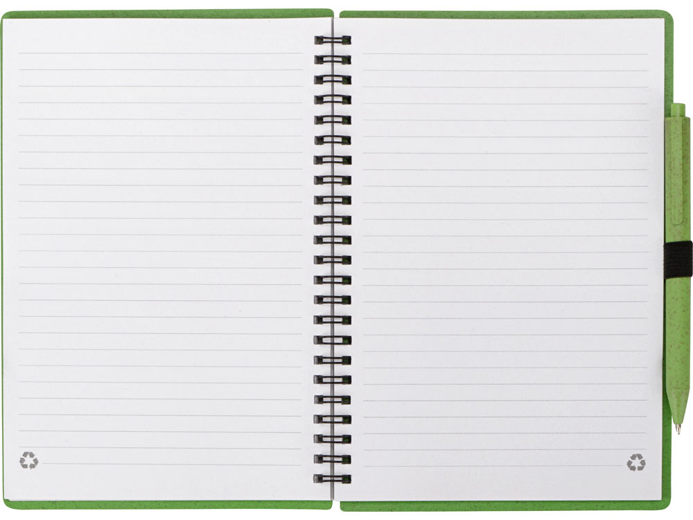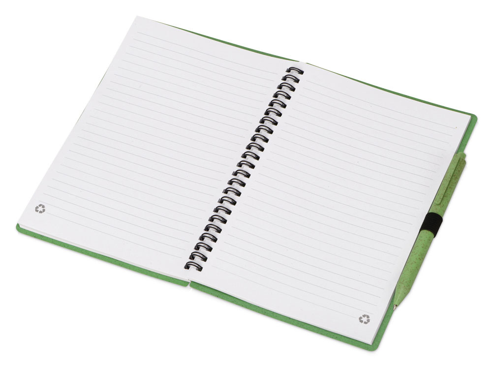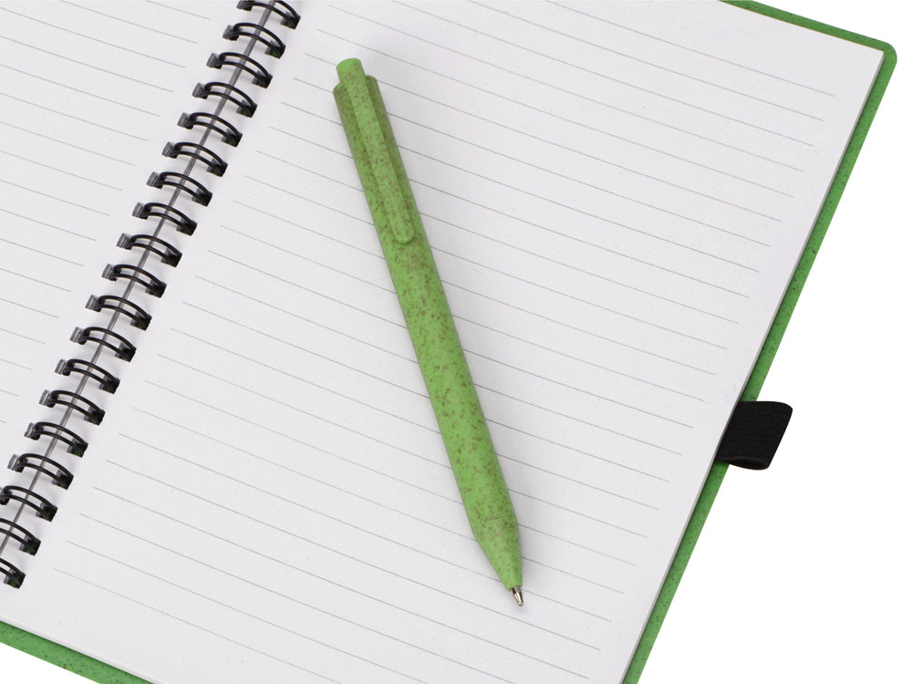 Блокнот с обложкой из переработанной пшеницы и пластика. Блок состоит из 80 листов переработанной бумаги белого цвета. Крепление – пружина. В комплекте шариковая ручка в тон блокноту из пшеничной соломы.