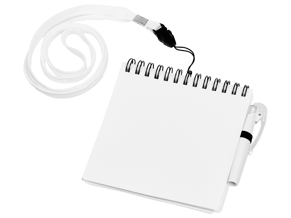 Яркий блокнот с шариковой ручкой можно носить на шее благодаря специальному ремешку (45 см). Отличный промо-сувенир, на обложку которого можно нанести логотип.