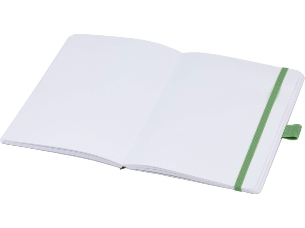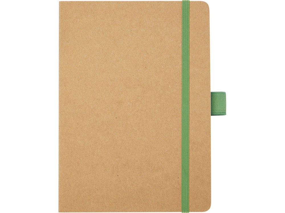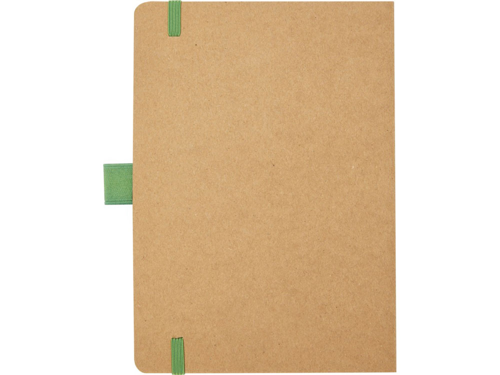 Блокнот формата из линованной переработанной бумаги (70 г/м²) с закругленными углами, цветной резинкой и петлей для ручки, соответствующей 107384 цветам ручки.