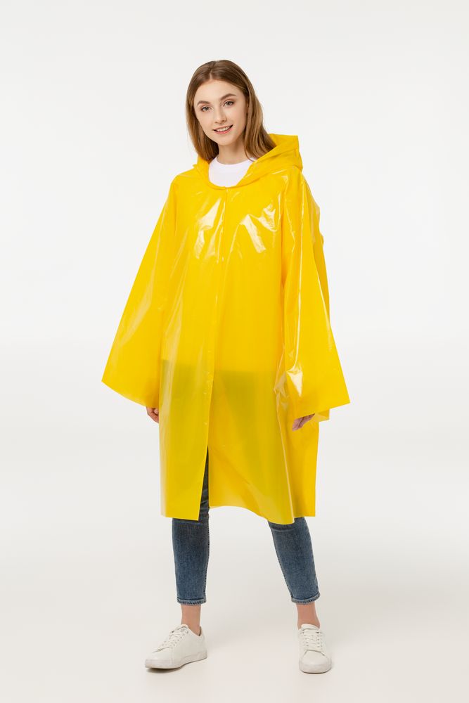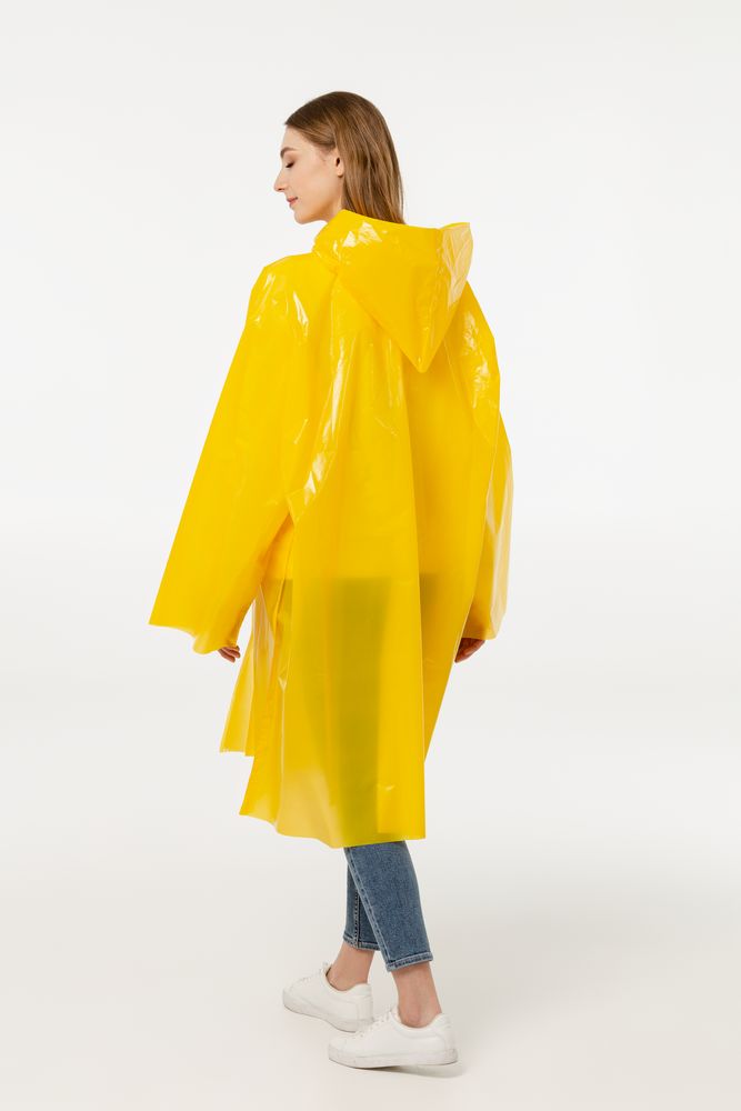 Дождевик-плащ с капюшоном и длинным рукавом из плотного полиэтилена высокого давления (ПВД).