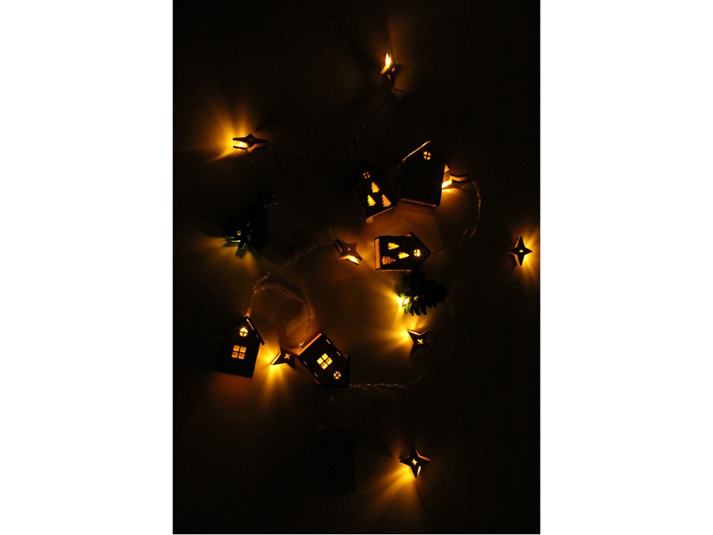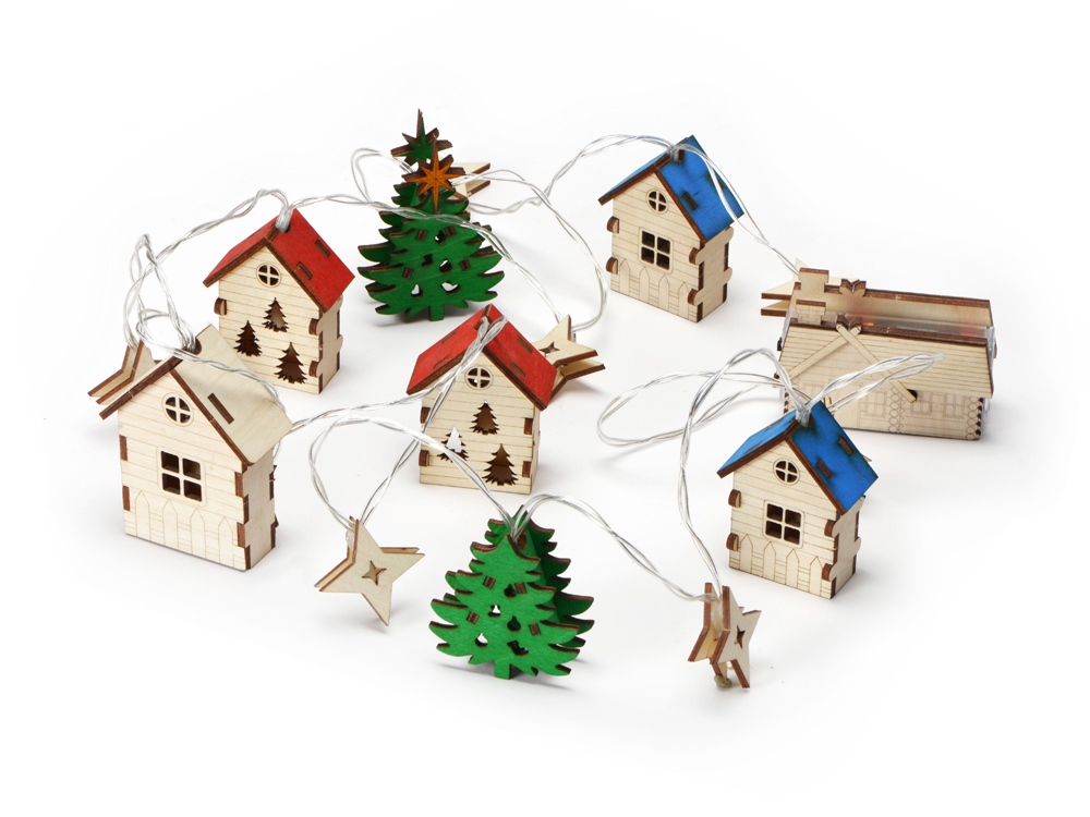 Светодиодная новогодняя елочная гирлянда постоянного свечения с цветными фигурками из натуральной березовой фанеры. Работает от 2-х батареек АА (в комплекте).