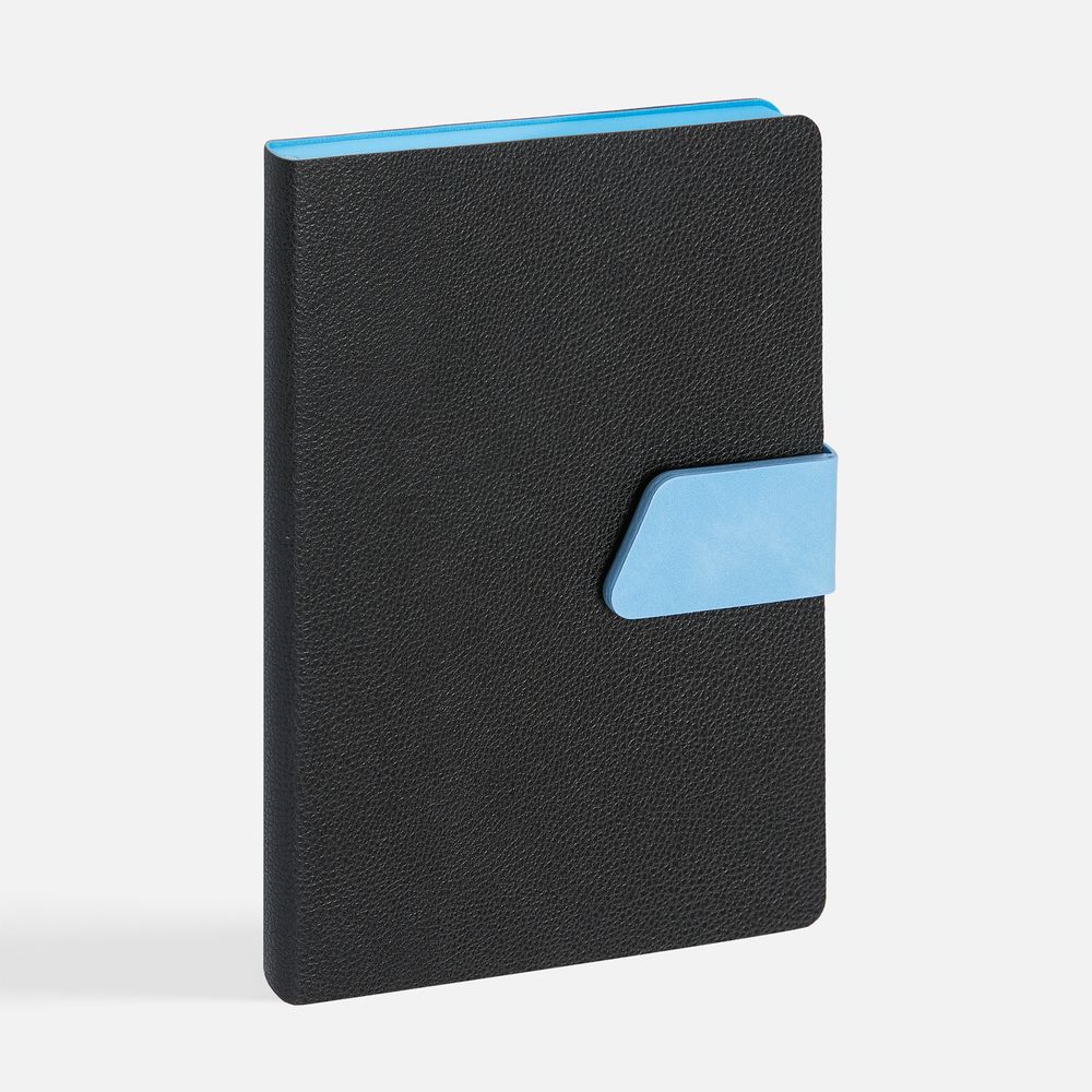Ежедневник с гибкой обложкой, выполнен из материала La Fite, черный АА и Nubuck Touch, голубой, дополнен голубым ляссе и хлястиком на кнопке.