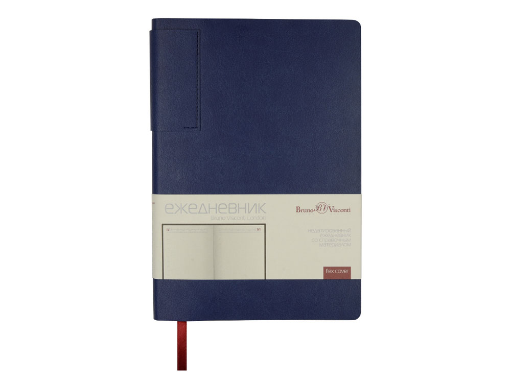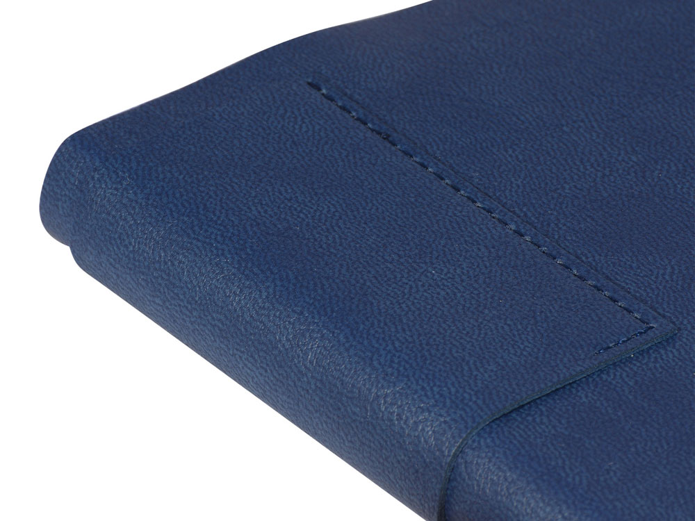 Лаконичная модель в ярком исполнении: гибкая обложка синего цвета с контрастной или в цвет обложки нашивкой. Выполнен из качественной и прочной искусственной кожи, крепление внутреннего блока — книжный переплет, закладка- ляссе. Углы обложки скруглены.