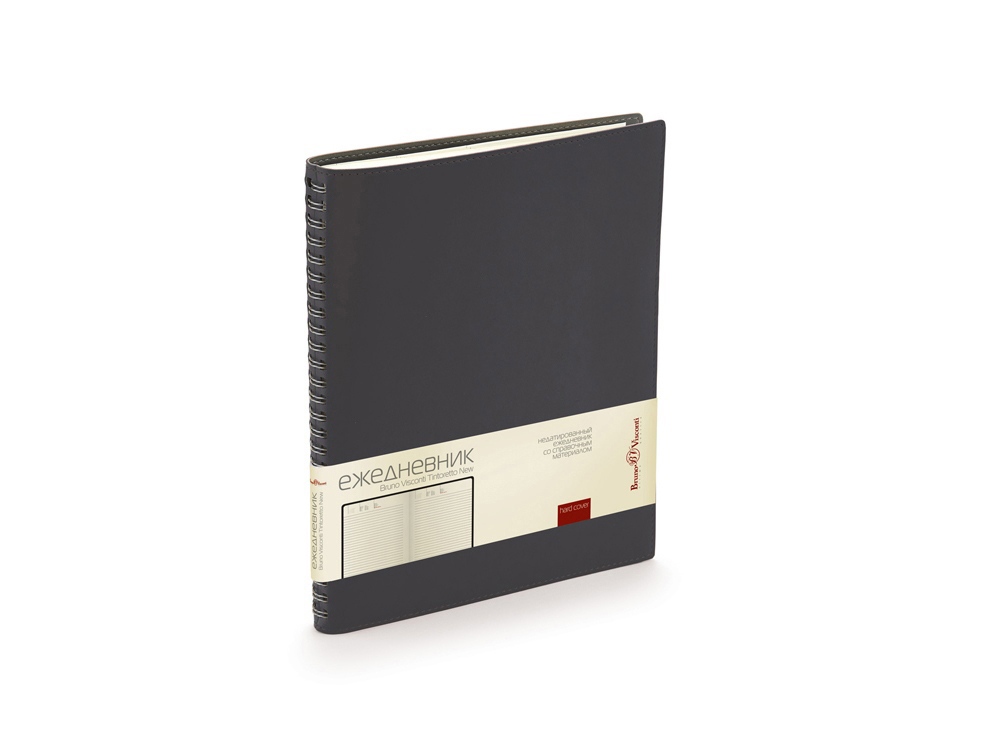Недатированные деловой ежедневник Tintoretto. Реальный шов по периметру в цвет материала Гибкий мягкий материал обложки прекрасно подходит для нанесения тиснения. Ежедневники выпускаются в формате В5, его размеры составляют 185 х 230 мм. Блок — 136 листов соединен полускрытым металлическим гребнем. Для блока используется высококачественная бежевая бумага, обладающая плотностью 70 грамм. В начале ежедневника расположены страницы со справочным материалом.