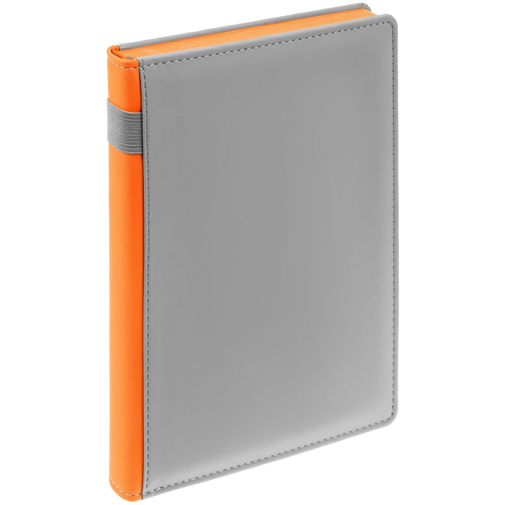 Твердая обложка с поролоном, материал обложки — Soft Touch, серый СС и Soft Touch, оранжевый ОО. На корешке ежедневника находится петля из резинки.