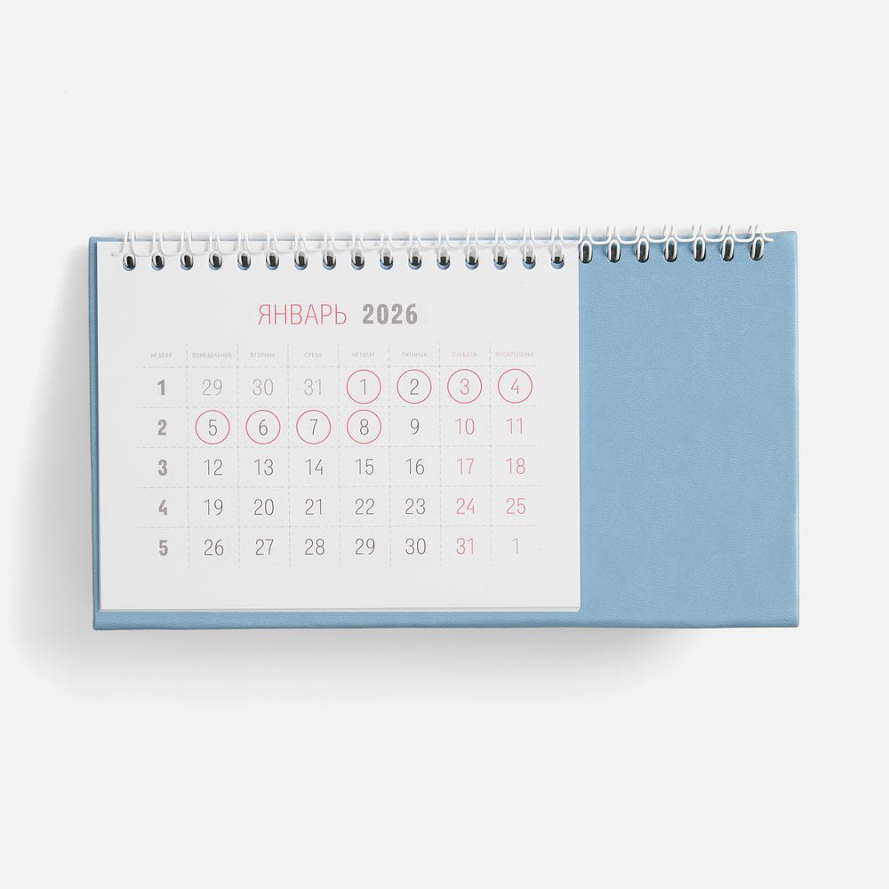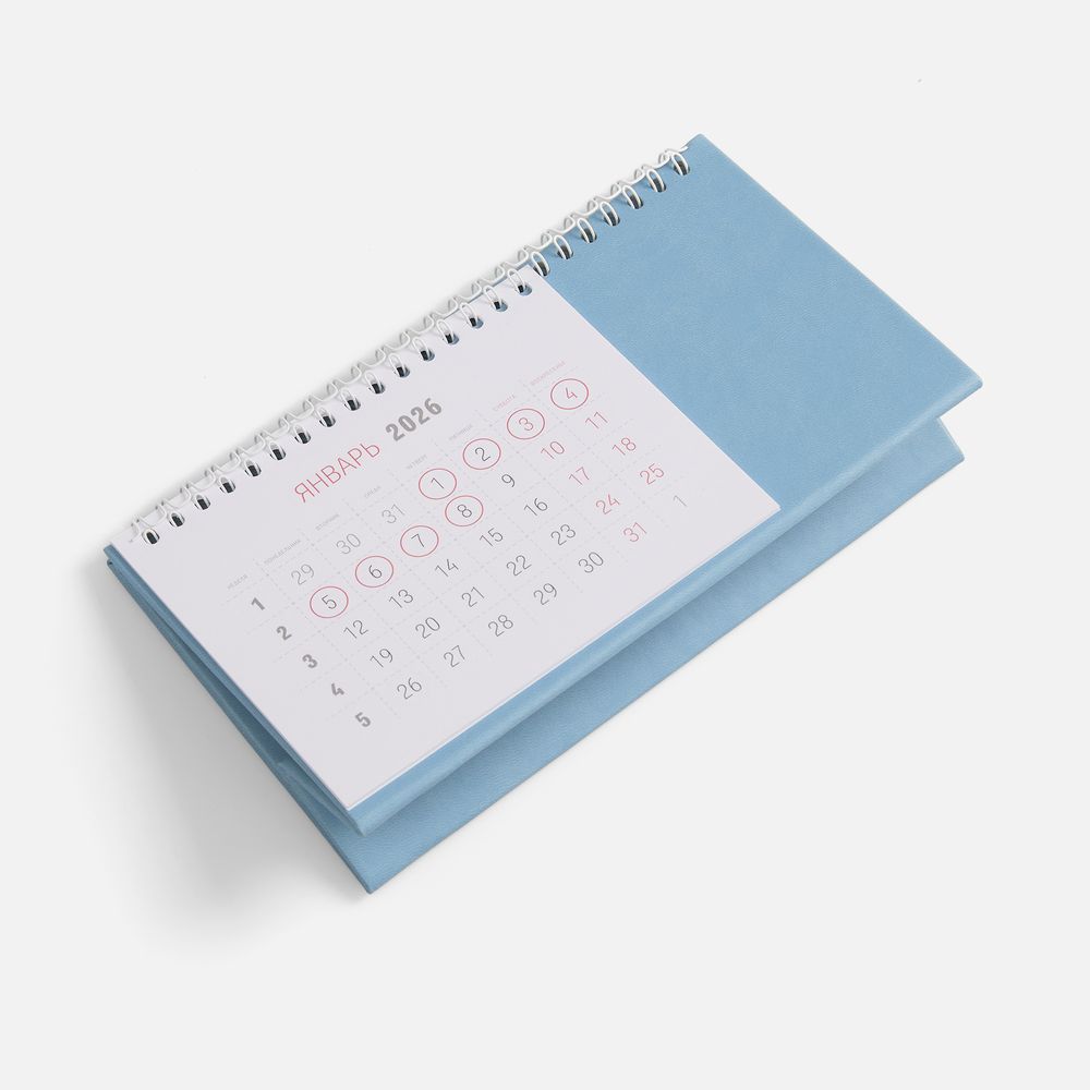Настольный, перекидной календарь-домик выполнен из материала Latte, голубой JJ.