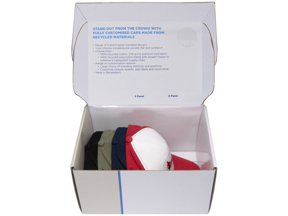 Коробка с образцами 4 бейсболок разных стилей: 1 Boston бейсболка из переработанного хлопка с 5 панелями, 1 Houston бейсболка из переработанного хлопка с 6 панелями, 1 Arizona бейсболка из переработанного хлопка с 5 панелями и многослойным козырьком и 1 Richmond Aware™ бейсболка из переработанного хлопка с 6 панелями и многослойным козырьком. Картон.