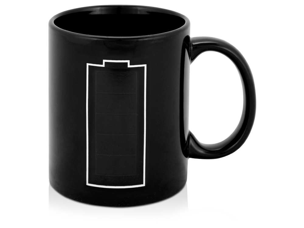 Креативная керамическая кружка на 320 мл черного цвета имитирует индикатор заряда батареи. Просто налейте в нее горячий напиток и батарейка зарядится. Замечательный подарок для любителей необычных вещей.