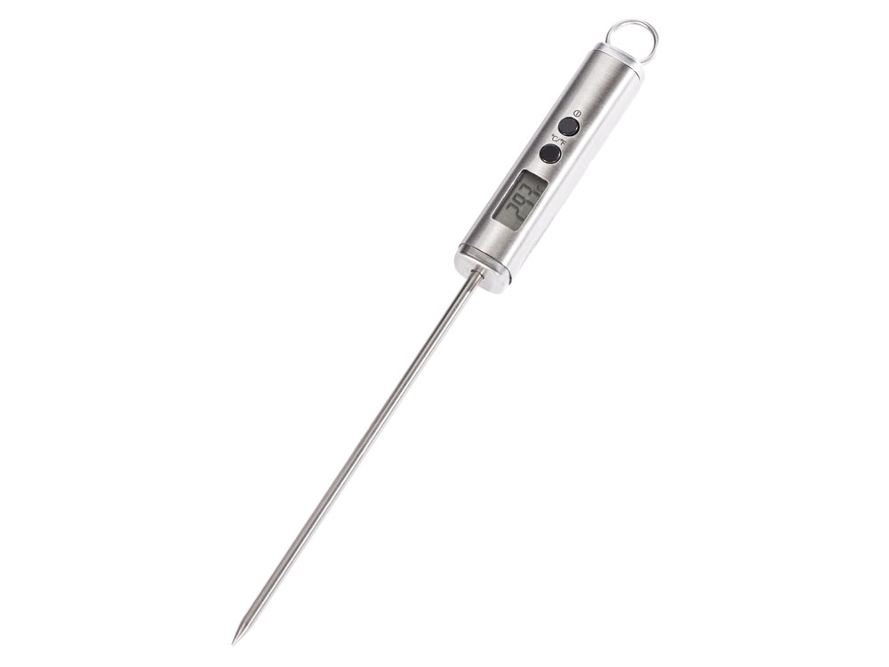 Steak — кулинарный термометр, который не даст вам ошибиться во время готовки! С ним все блюда будут поданы в нужной кондиции, а стейки — прожарены ровно настолько, насколько вам нужно — просто воткните острие термометра в пищу, и на электронном табло появится температура.
