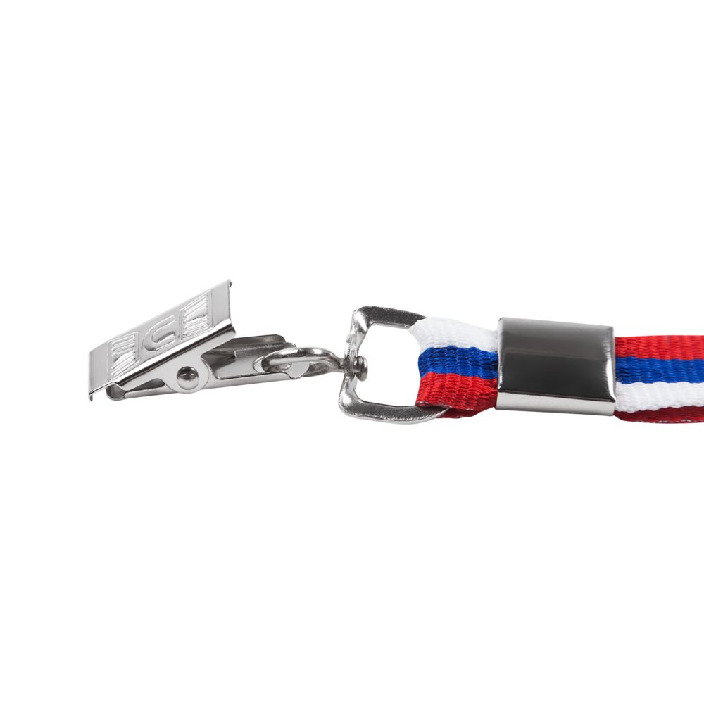 Бейдж крепится к ленте с помощью металлической клипсы.