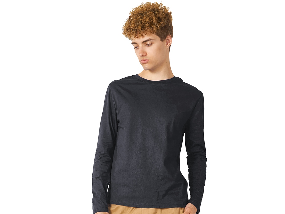 Футболка с длинным рукавом комфортной посадки с боковыми швами. Горловина обработана рибом 1х1 и тесьмой по спинке. Футболка выполнена из хлопкового джерси.