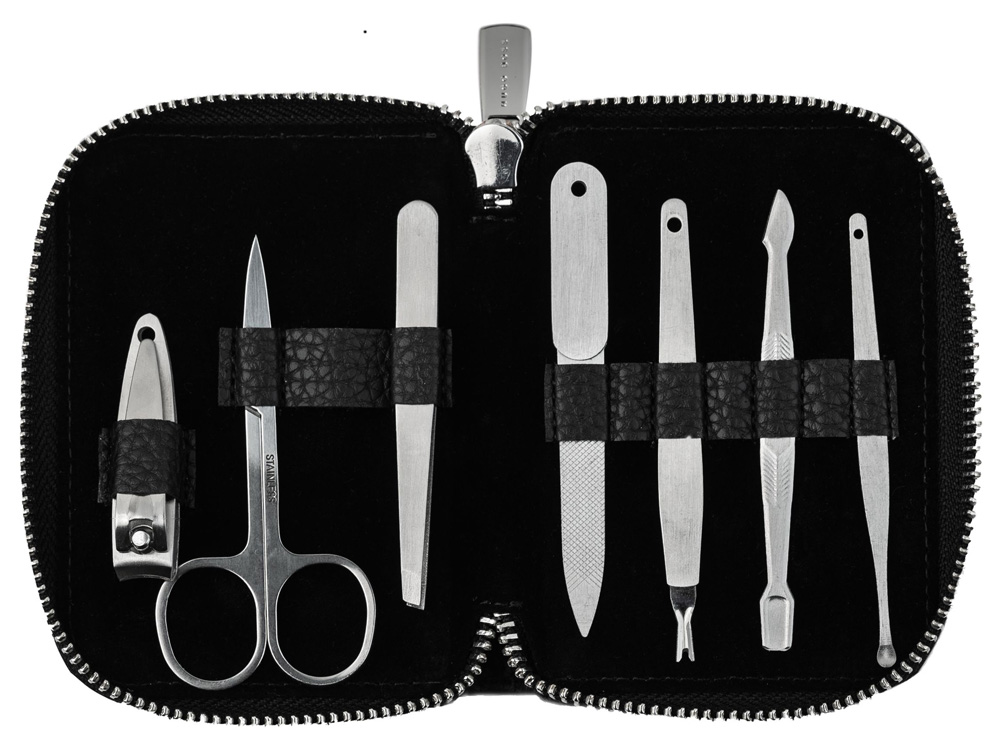 Футляр набора для маникюра Storyline выполнен из мягкой эко кожи с зернистой текстурой и украшен красивым хромированным логотипом HUGO BOSS. Футляр застегивается на молнию с логотипом HUGO BOSS. Благодаря компактному размеру набор удобно брать с собой в поездки и путешествия. В набор входит всё самое необходимое: пилочка для ногтей, ножницы, пинцет, ножницы для стрижки ногтей, палочка для чистки ушей, лопатка и триммер для удаления кутикулы.