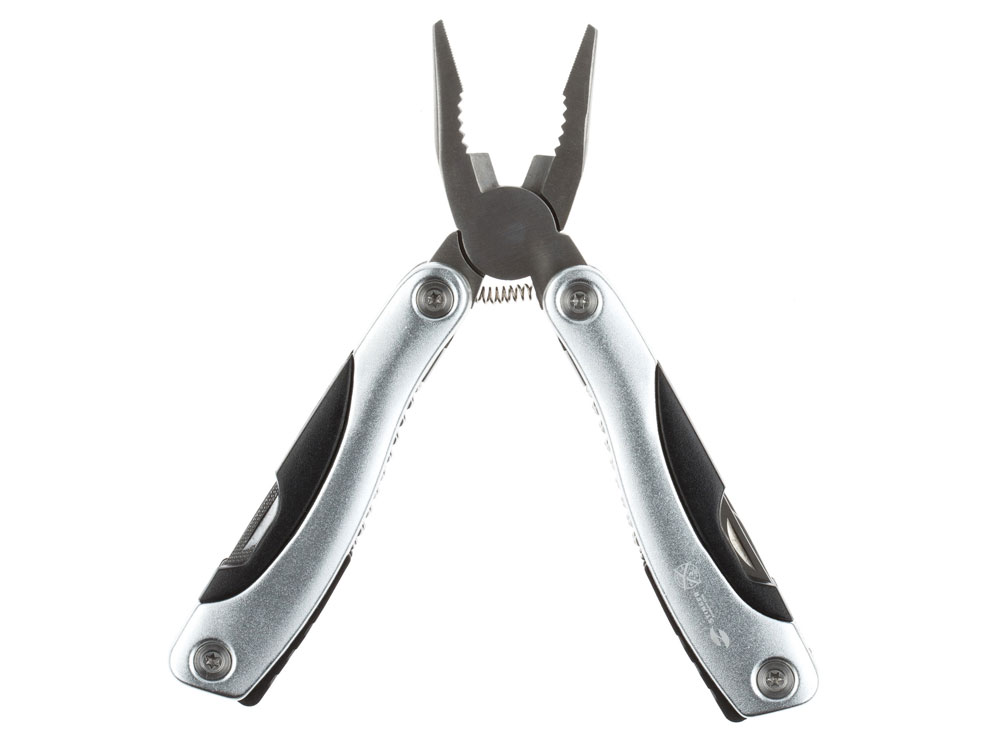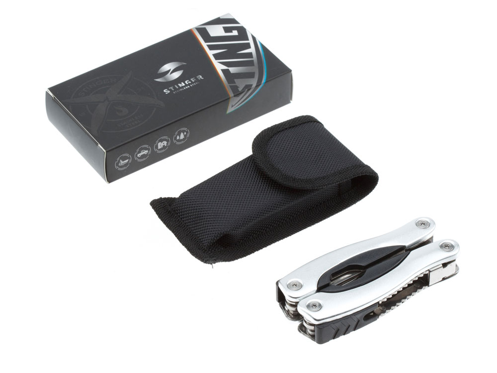 Мультитул Stinger, 100×50 мм, 15 функций, сталь/алюминий/пластик, серебристый, в нейлоновом чехле