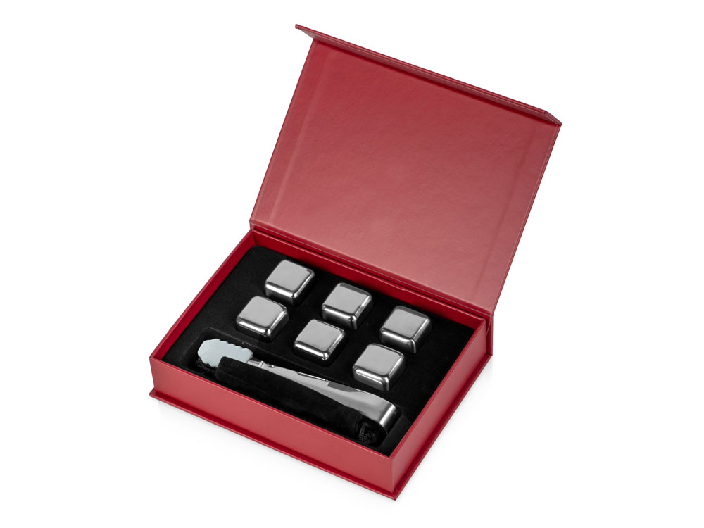 Набор для виски со стальными охлаждающими камнями, щипцами, мешочком в коробке, кашированной картоном.