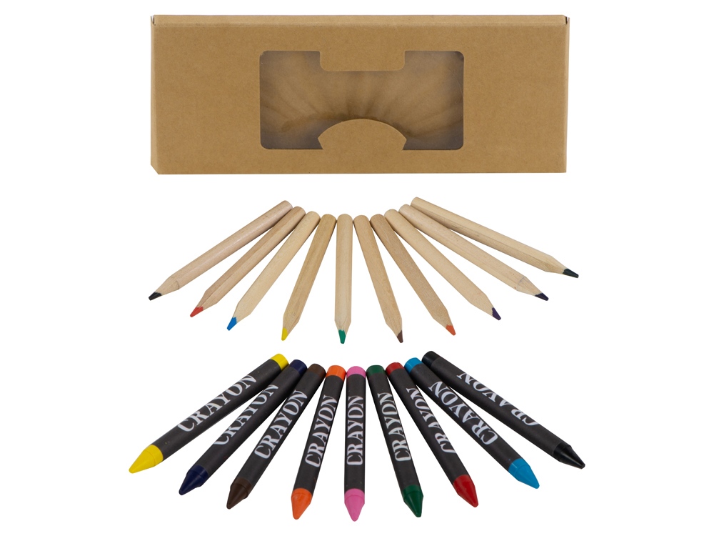 Набор из 19 карандашей. 9 цветных восковых карандашей и 10 цветных карандашей в картонной коробке с пластиковым окошком.