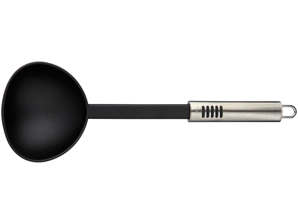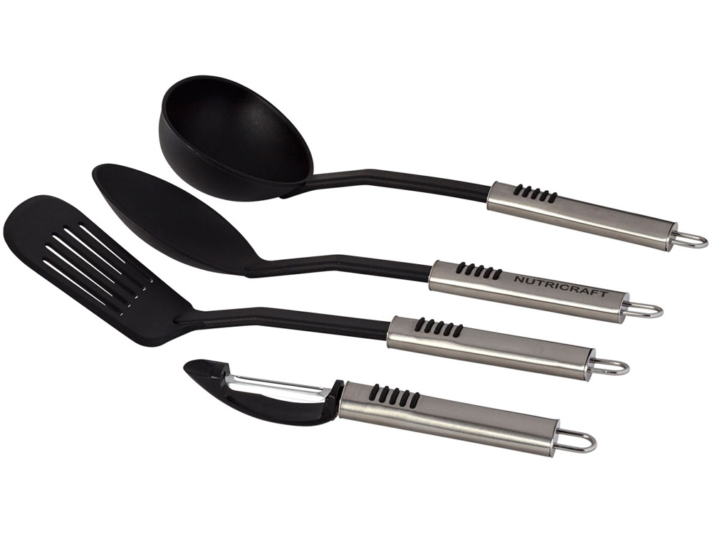 Кухонный набор из 4 предметов. Облегченный набор из четырех предметов включает чистильный нож, ложку, лопатку для сковороды и половник. Отверстия в ручках – для возможности повесить в кухне. Набор упакован в коробку Paul Bocuse. Нержавеющая сталь и нейлон.