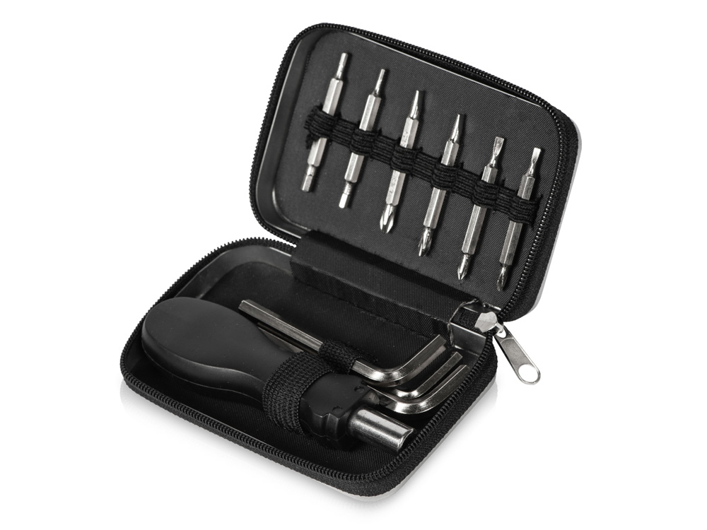 Этот компактный набор содержит 15 инструментов: 3 шестигранных ключа, 6 двухсторонних насадок с битами и ручки к ним. Весь набор компактно упакован в футляр с фиксирующими резинками, которые удерживают инструменты на створках.