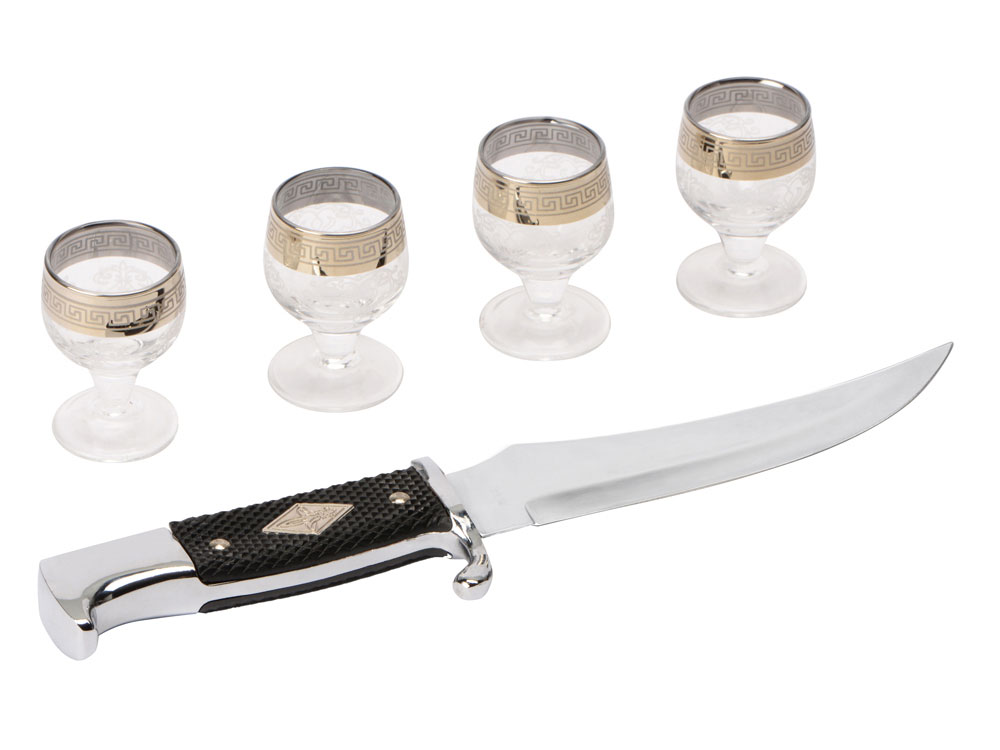 Шкатулка-футляр – хороший подарок, особенно, если в ней достойное содержание. Например, набор рюмок на 4 персоны и нож для закуски. Отдельно такой набор дарить не солидно – не красиво преподносить стопки без упаковки, а пустая шкатулка только разочарует – открывая такую красоту, всегда ждешь внутри что-то чудесное.