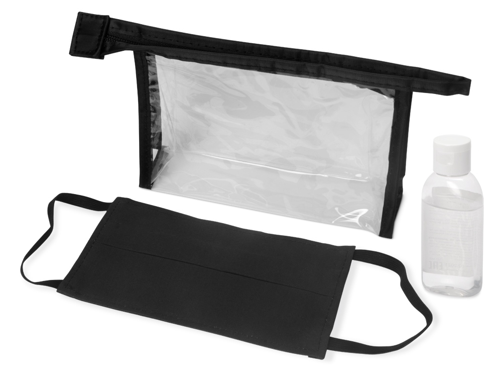 Самое необходимое всегда под рукой – в любом месте и при любой ситуации. Многоразовая хлопковая маска черного цвета и антисептик в стильной пластиковой косметичке поместятся в любой сумке.