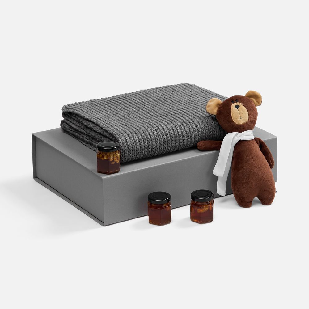 Милый мишка в шарфике с целой коллекцией разнообразного ароматного меда идеально дополняет основной, более практичный подарок — объемный шарф из толстой пряжи, который впишется в любой зимний образ.