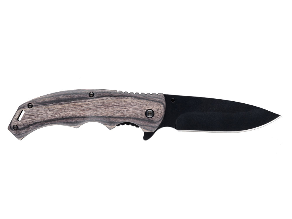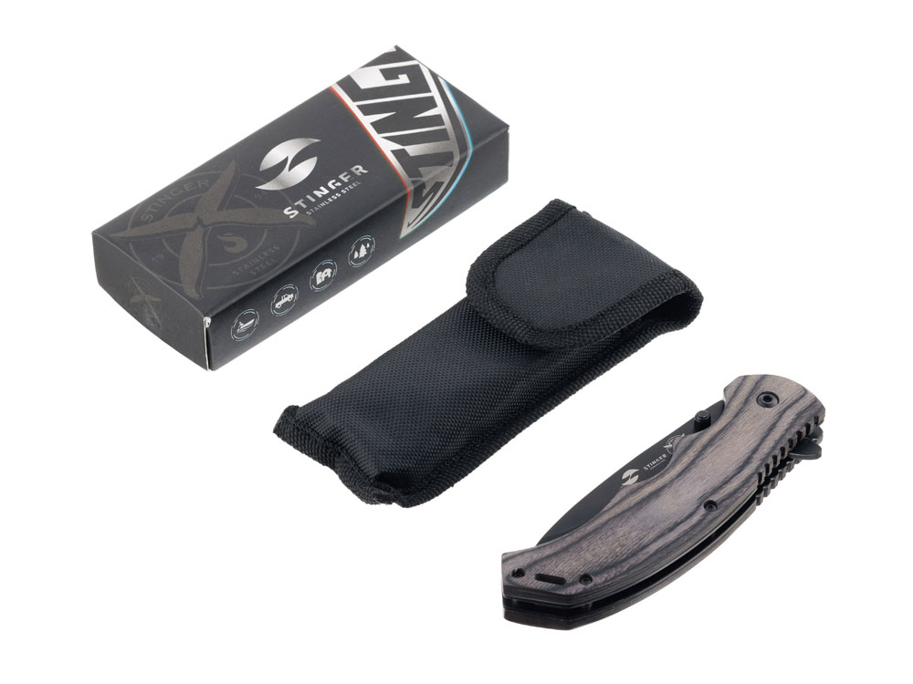 Нож складной Stinger, 120 мм, (чёрный), материал рукояти: дерево/сталь (серый), в картонной коробке