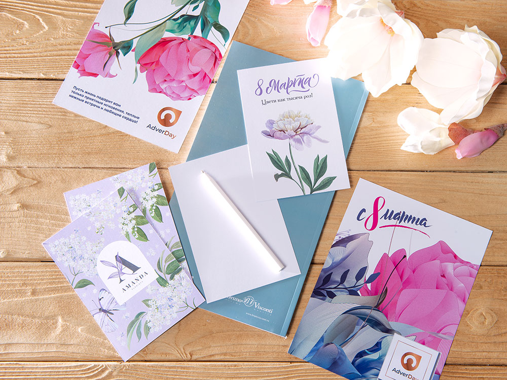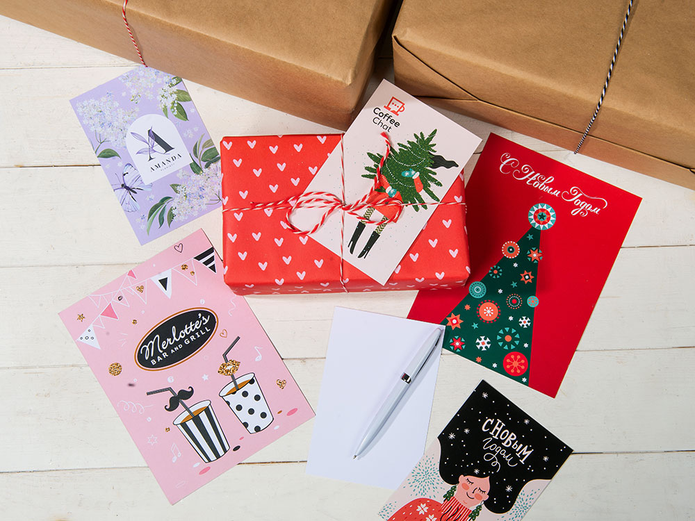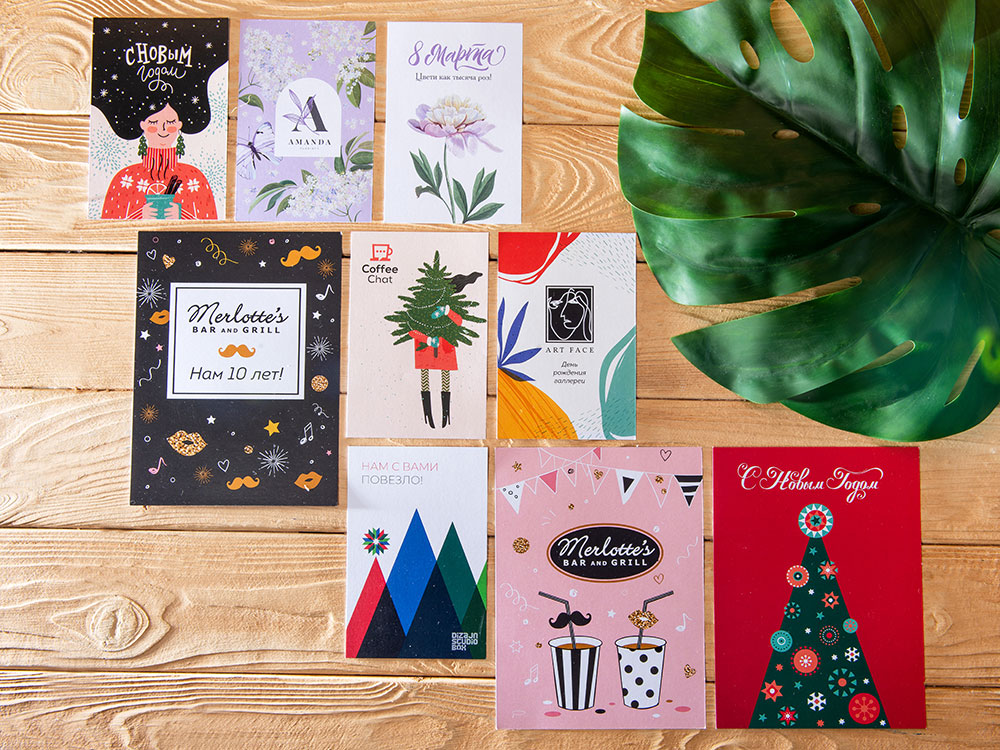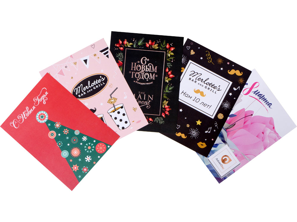 Открытка формата А5 из высококачественной глянцевой бумаги 300 гр. Предназначена для нанесения индивидуального дизайна заказчика с одной или обеих сторон.