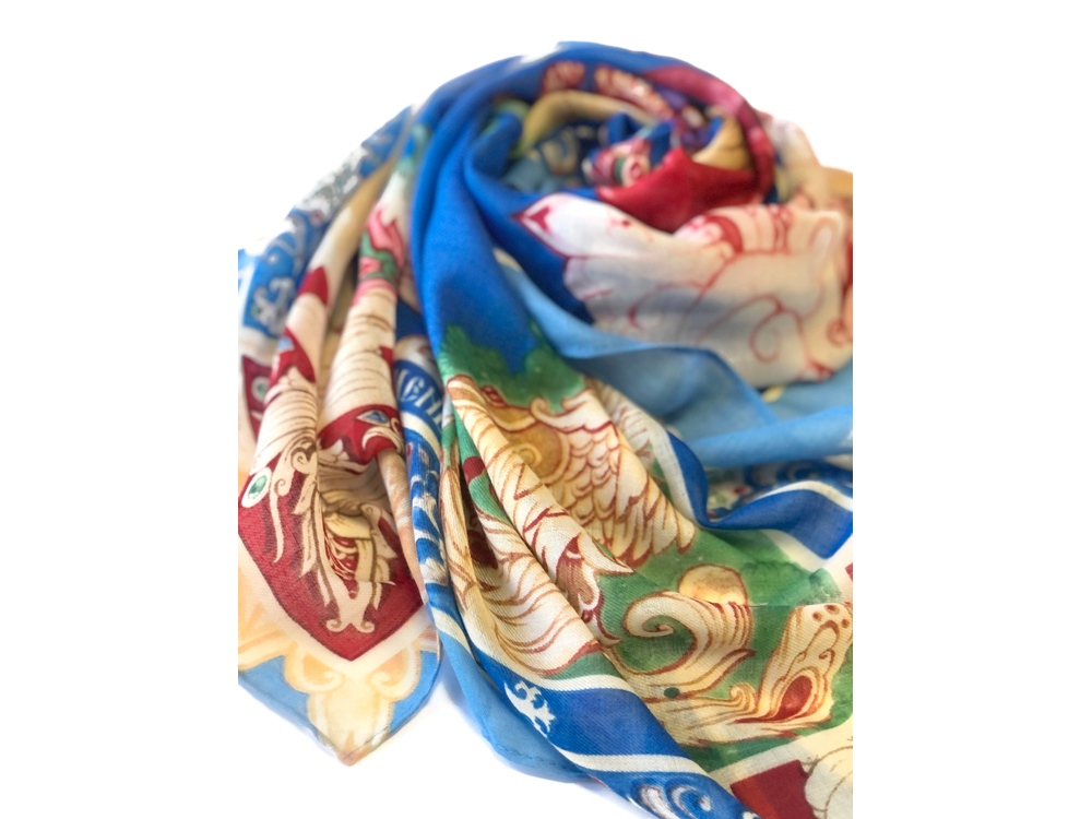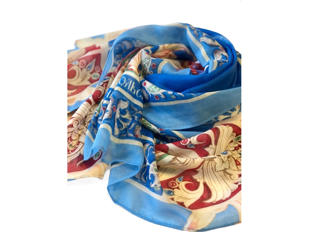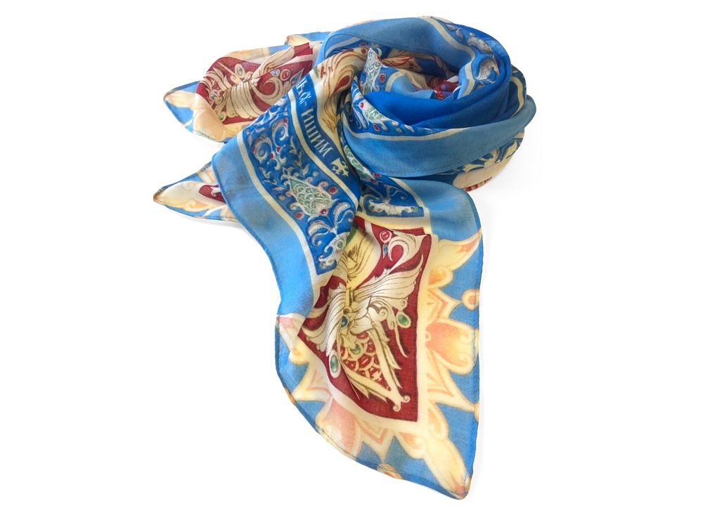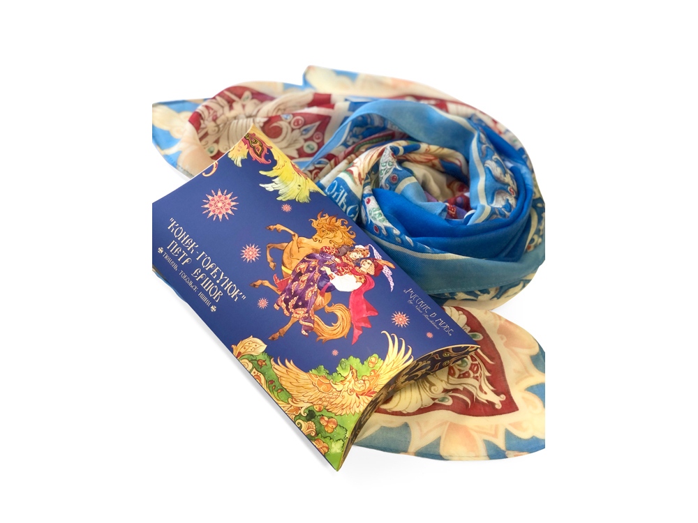 Прочитав сказку юного дарования, сам великий Александр Сергеевич Пушкин сказал: Этот род сочинений я могу теперь оставить – и Петр Ершов был принят в круг петербургских писателей.В этом году сказке из золотого фонда русской литературы, переведенной на все языки мира, исполняется 185 лет. Ее яркие краски мы перенесли на шелк и создали платок Конек-Горбунок. Благодаря тонкой работе дизайнера, со страниц книги, как живые, сошли герои любимой с детства истории: Иван, прекрасная Царь-девица и волшебный Конек-Горбунок. А в роскошных орнаментах сплелись легендарное перо Жар-птицы, Красное Солнышко и Месяц…