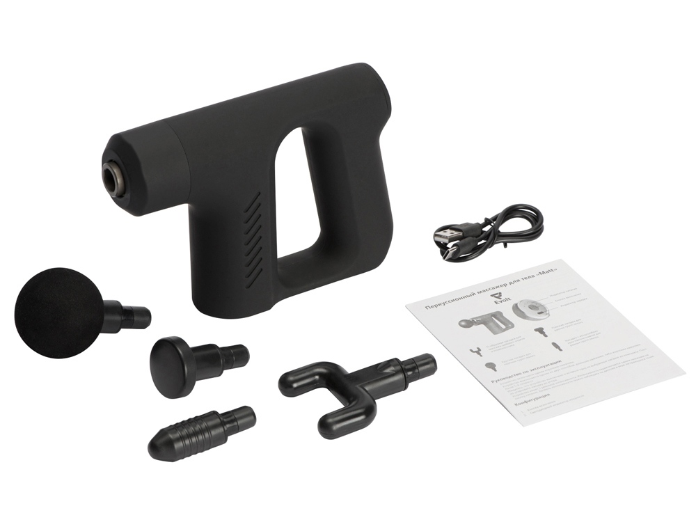 Массажёр оснащён четырьмя насадками и светодиодным индикатором мощности, что позволяет его использовать для разных групп мышц, подбирая необходимый тип массажа и его интенсивность.