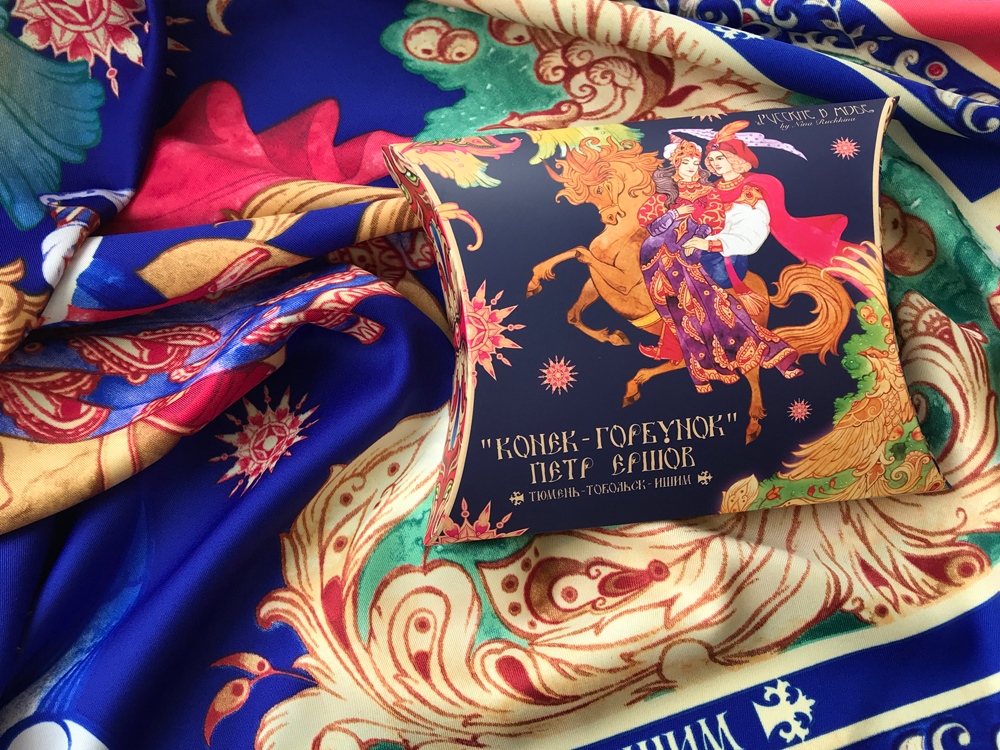 Прочитав сказку юного дарования, сам великий Александр Сергеевич Пушкин сказал: Этот род сочинений я могу теперь оставить — и Петр Ершов был принят в круг петербургских писателей.В этом году сказке из золотого фонда русской литературы, переведенной на все языки мира, исполняется 185 лет. Ее яркие краски мы перенесли на шелк и создали платок Конек-Горбунок.