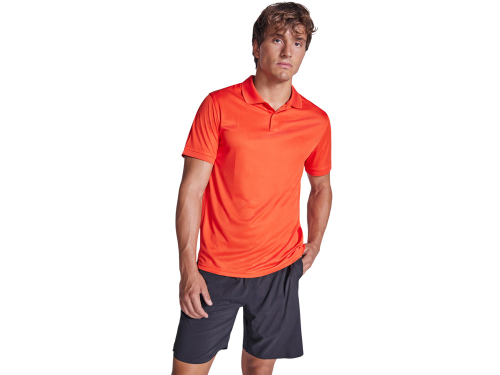 Мужское поло с коротким рукавом из технологичного полотна. Рибовый воротник 1х1, застежка на кнопки. Отстрочка в тон. Рибовые манжеты.