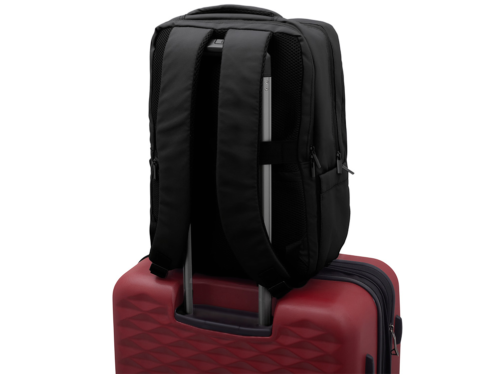 Непромокаемый бизнес рюкзак с двумя вместительными отделениями и карманом на молнии спереди. В одном отделении расположены карман для ноутбука и планшета, в другом органайзер и много пространства для одежды и других вещей на случай деловой поездки. На сетчатой спинке расположен потайной кармана на молнии для документов и личных вещей и ремень для крепления на ручку чемодана. Сверху удобная мягкая ручка для переноски. Лямки регулируются по длине.